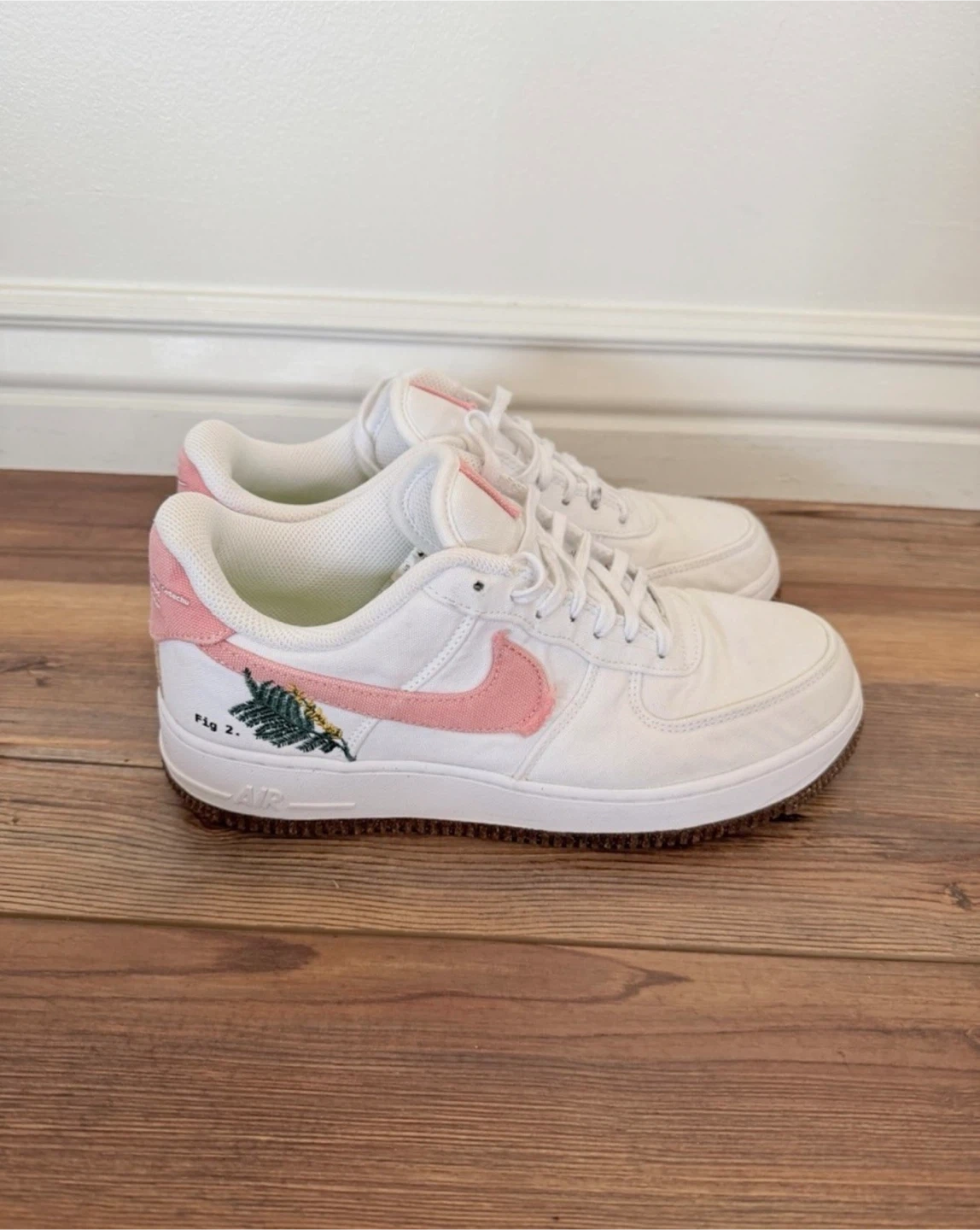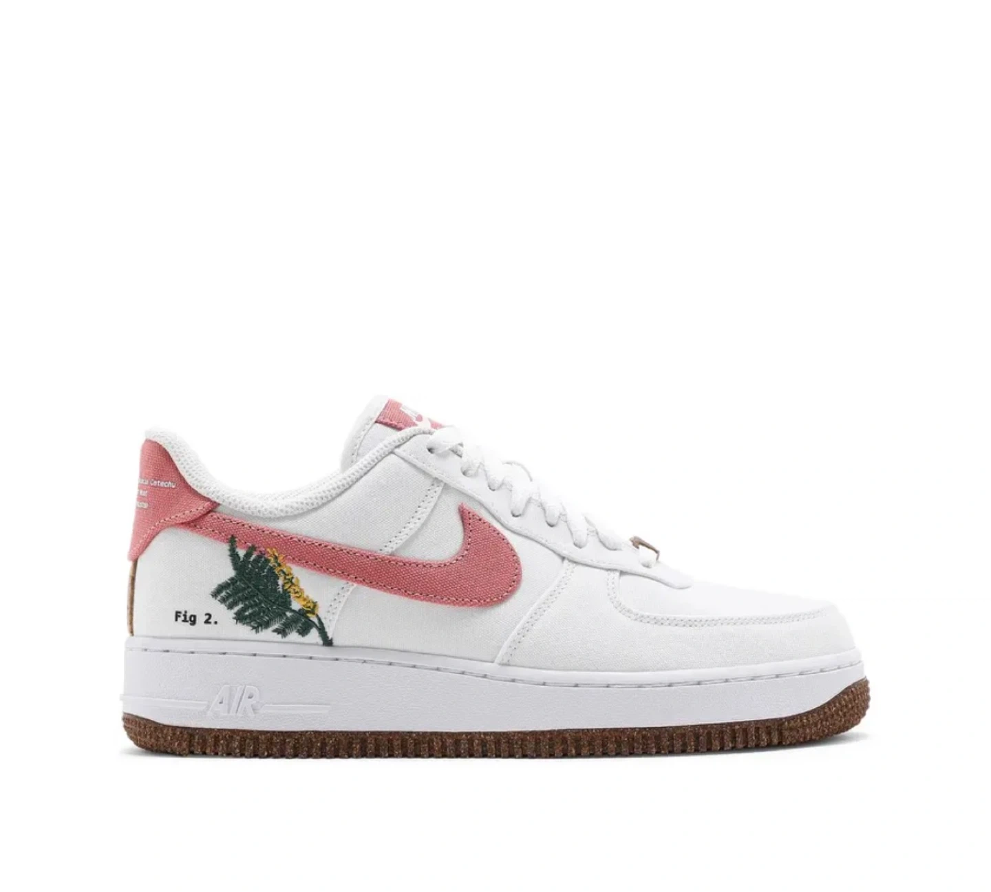 White canvas Nike Air Force 1 '07 SE sneakers with pink accents and embroidered botanical detail. Features a classic Air sole unit for comfort. These are a women's size 8.
