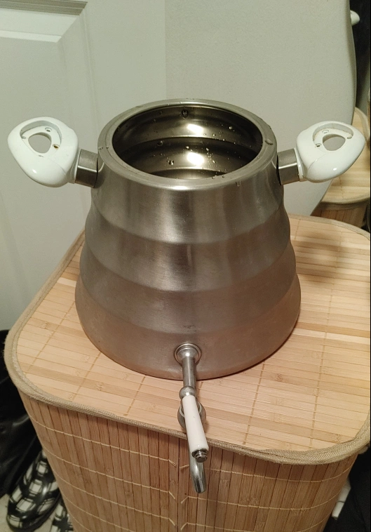Stainless steel water dispenser with a convenient spigot. It has two white handles for easy carrying. Great for serving drinks at gatherings!