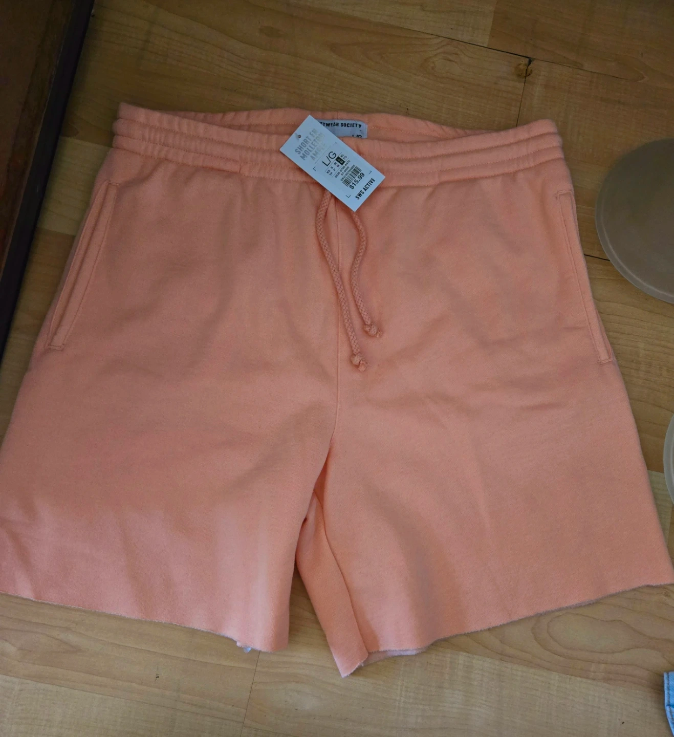 These are peach-coloured shorts from Athletic Society. They're a size Large with an elastic waistband and drawstring. The material is a molleton blend.