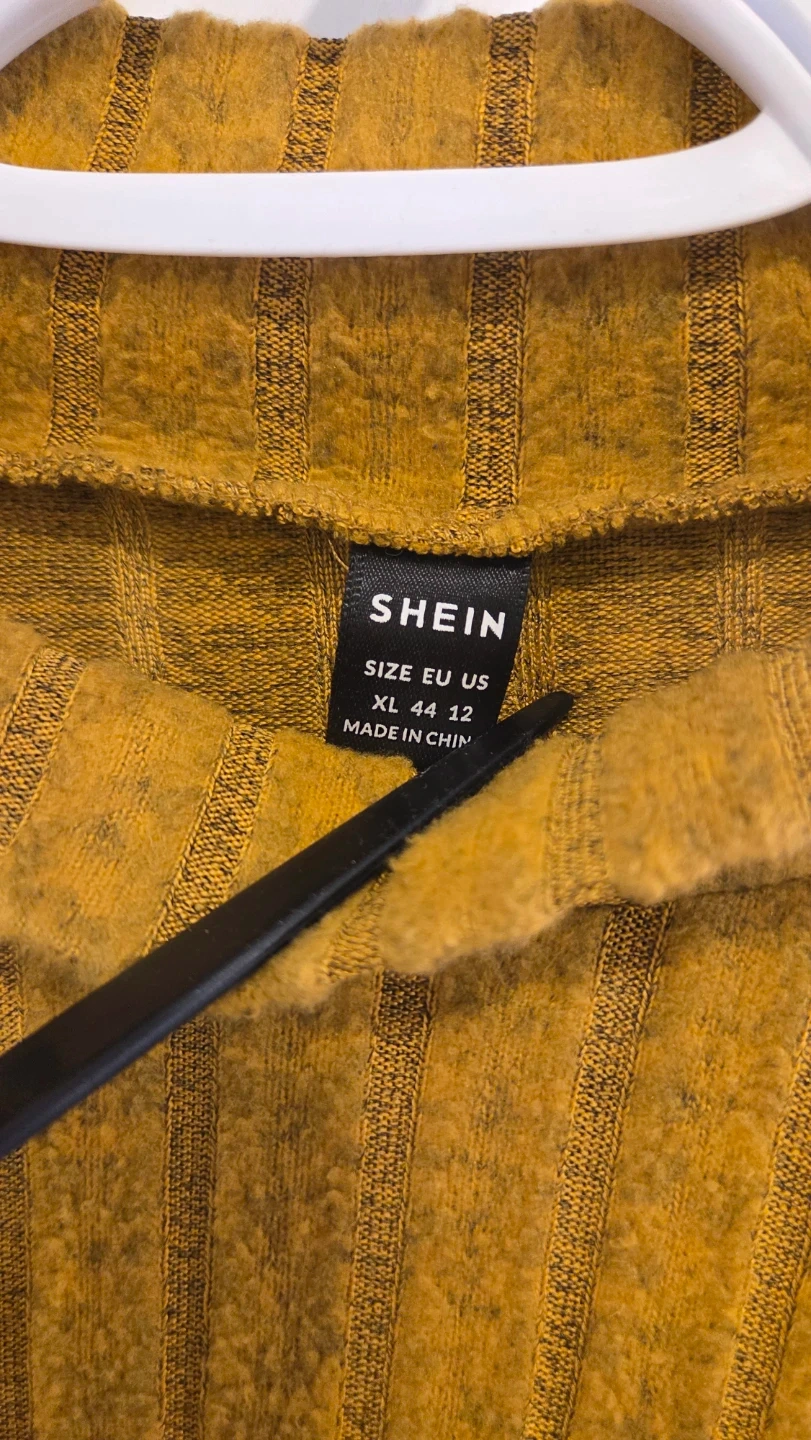 A mustard yellow ribbed long-sleeve top from SHEIN. It's a mock neck style with a textured knit. This top's XL size is equivalent to EU 44 and US 12.