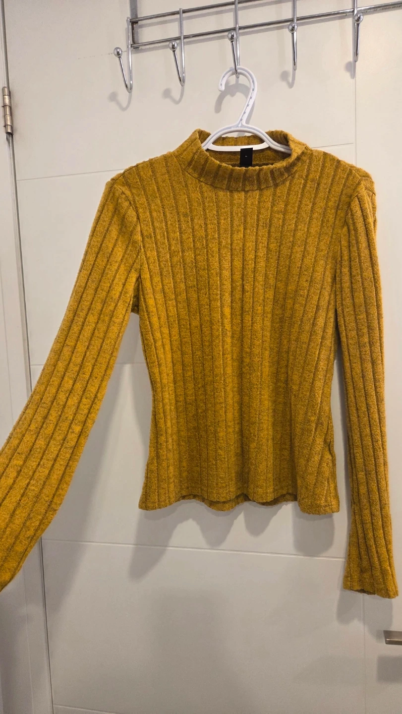 A mustard yellow ribbed long-sleeve top from SHEIN. It's a mock neck style with a textured knit. This top's XL size is equivalent to EU 44 and US 12.