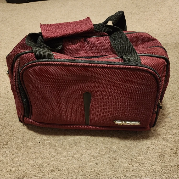 33Selling a Tracker carry-on bag in burgundy colour. It's in good condition and measures approximately 8 in X 11 in X 16 in. Like new. Perfect for your next trip!