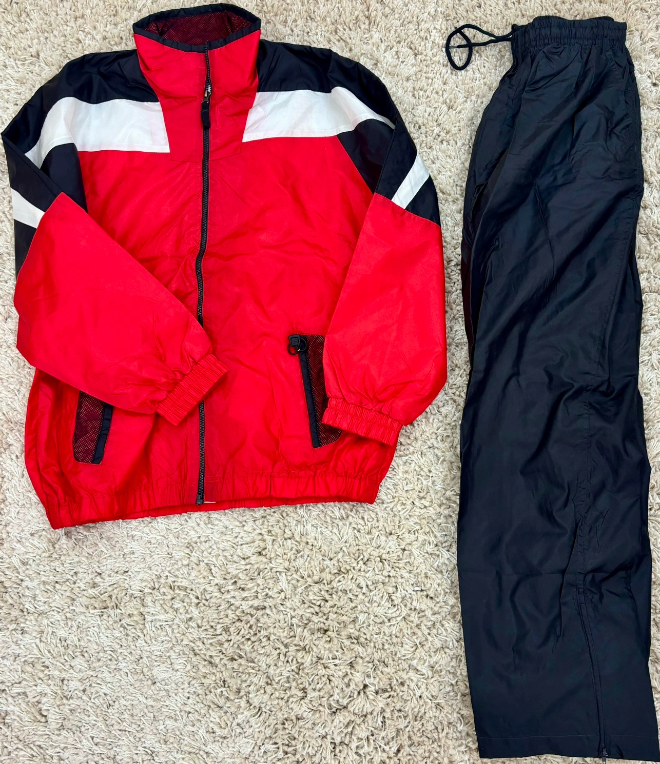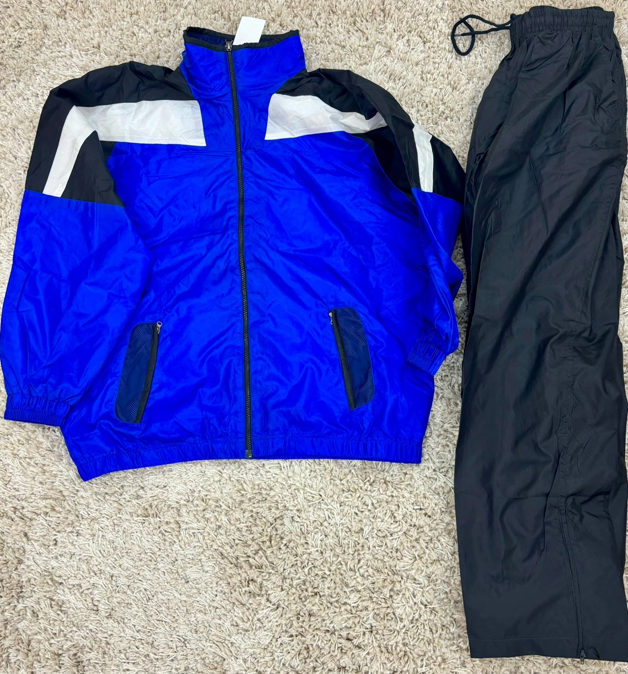 A tracksuit with a jacket and pants. The jacket has a zipper and comes in both red and blue. The pants are black in sizes from Small to XL Sale price $20 each or buy 6 for $100