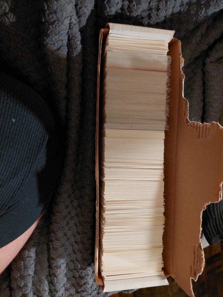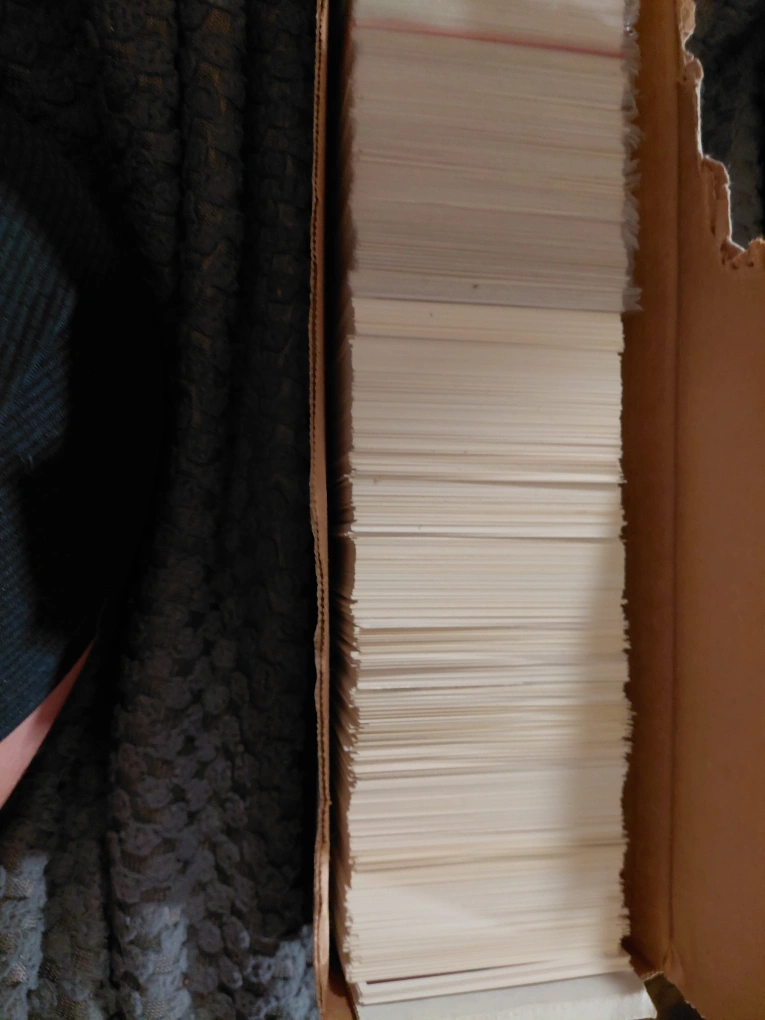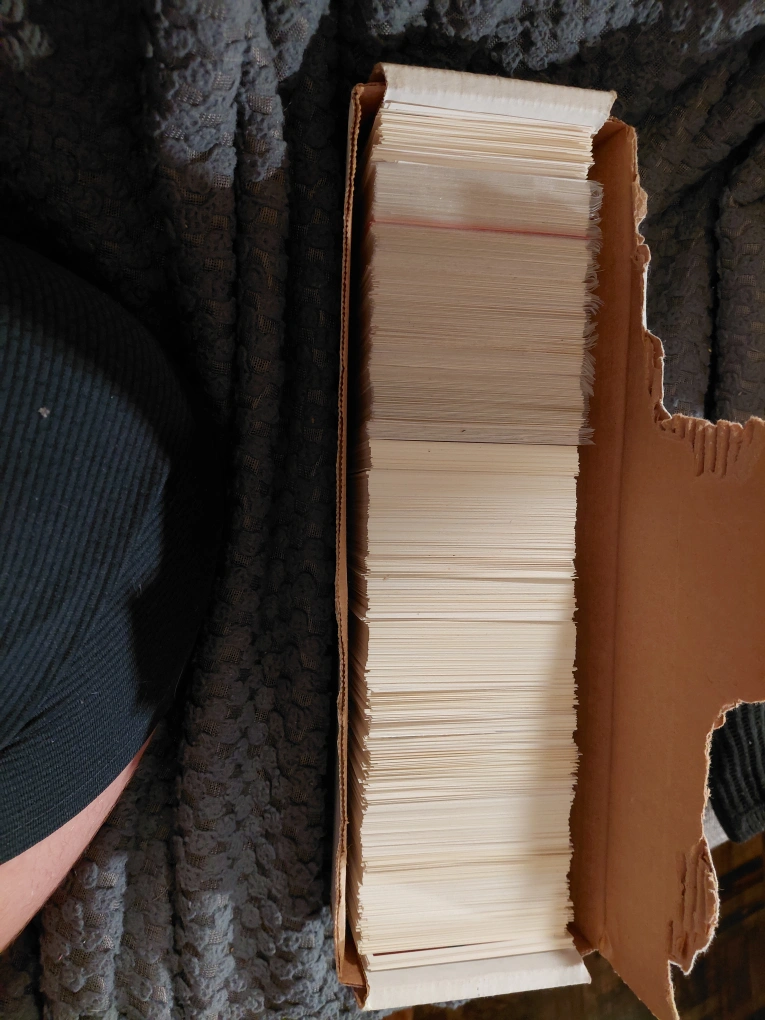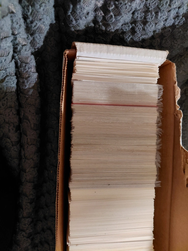 I'm selling a large collection of trading cards, all neatly stored in a cardboard box. These cards are perfect for collectors or anyone looking to start a new hobby. They're in good condition and ready for a new home