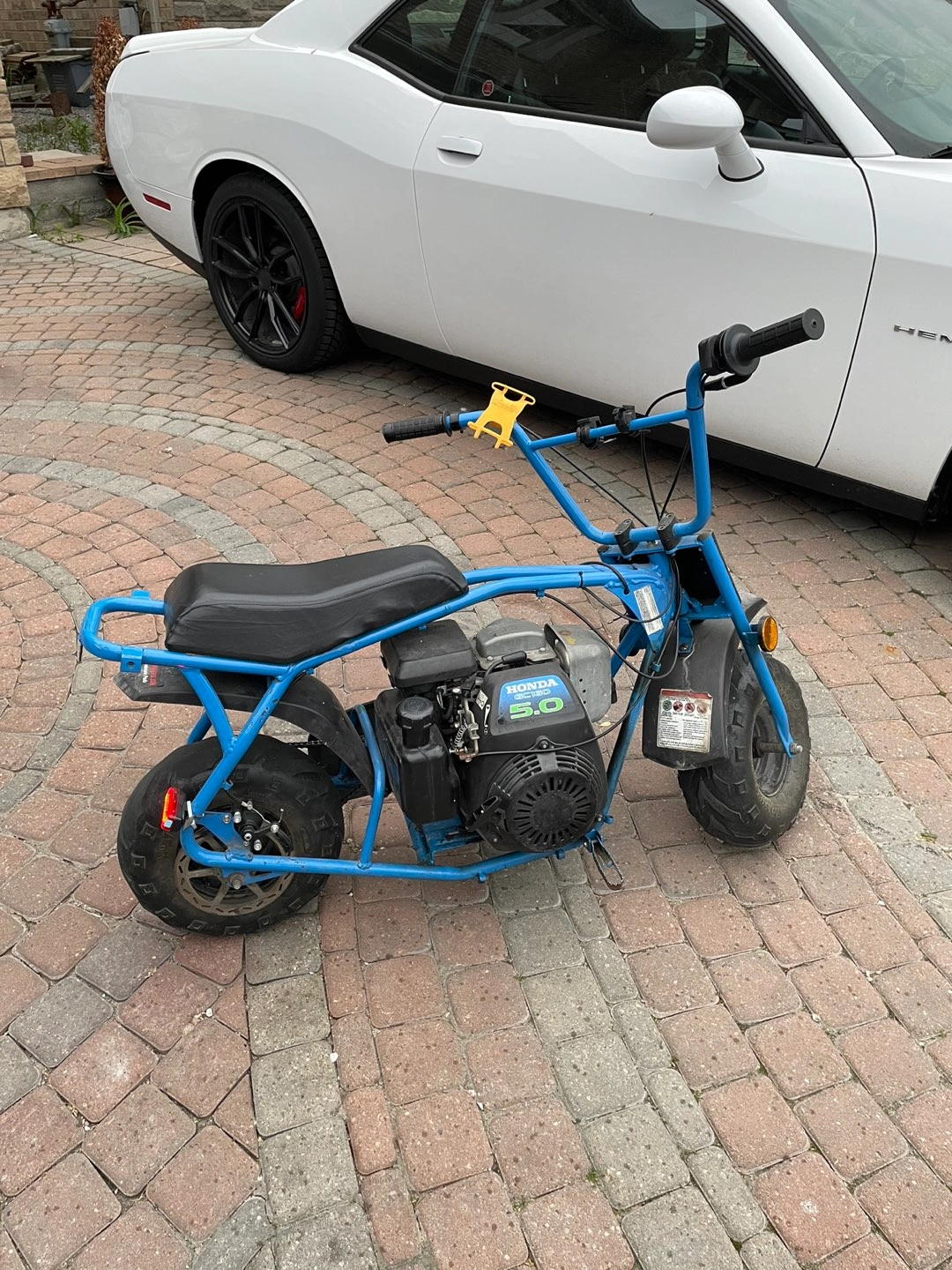 10Baja mini trail bike with upgraded Honda 5.0 engine, it runs and stops smoothly. Ready to go, comes with rear and front lights and phone holder.