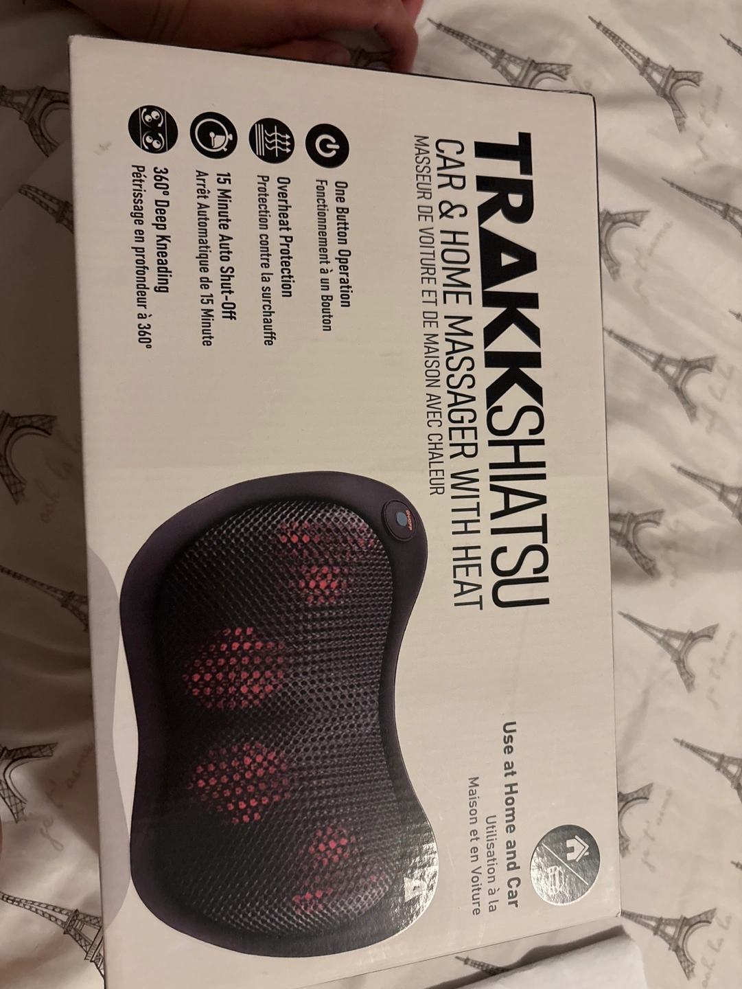 Neck and back massager. Use at home or in car. Features one-button operation, overheat protection, and 15-minute auto shut-off. 360° deep kneading massage.
