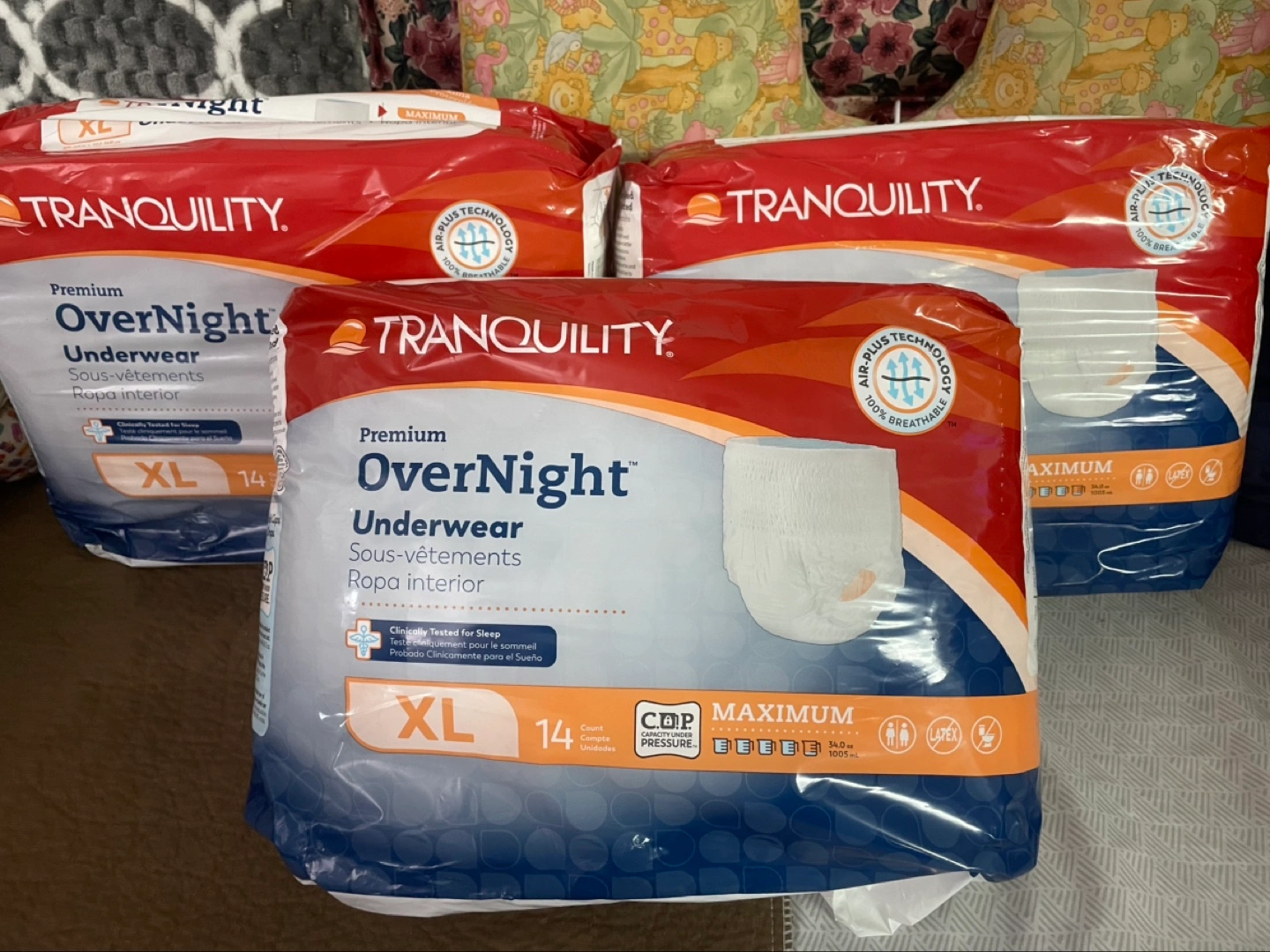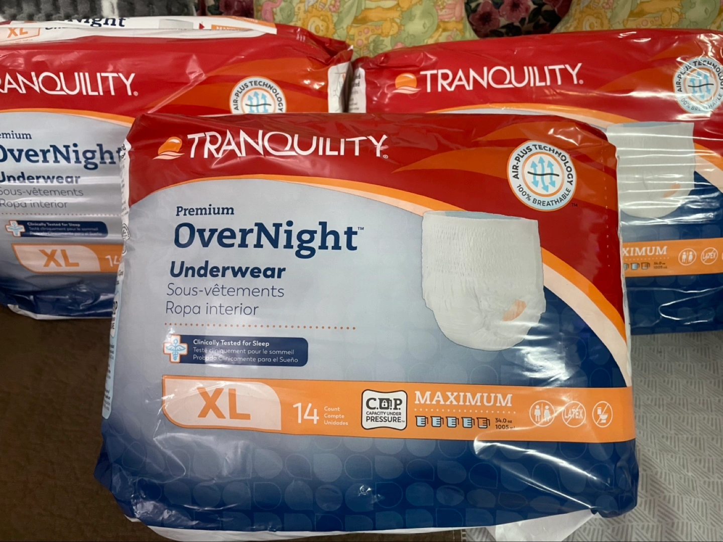 Five packs of Tranquility Premium Overnight Underwear. Size XL. Maximum absorbency. Clinically tested for sleep. New, unopened.each bag $15,I have Tena Large Adults pull up’s I have 18 , bags each bag has 14 pics ,each bag $15 Pick up Markham and Lawrence.