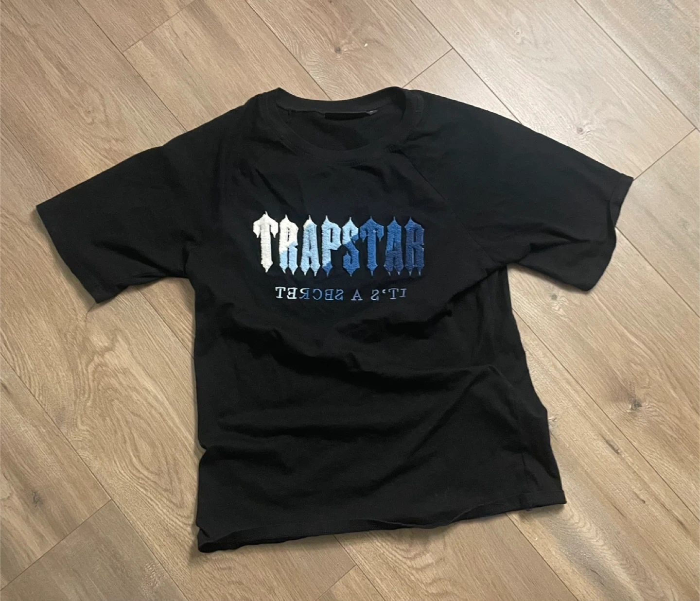 Selling a black Trapstar T-shirt. The shirt features the Trapstar logo in a blue and white gradient design. It's in great condition and ready for a new home
