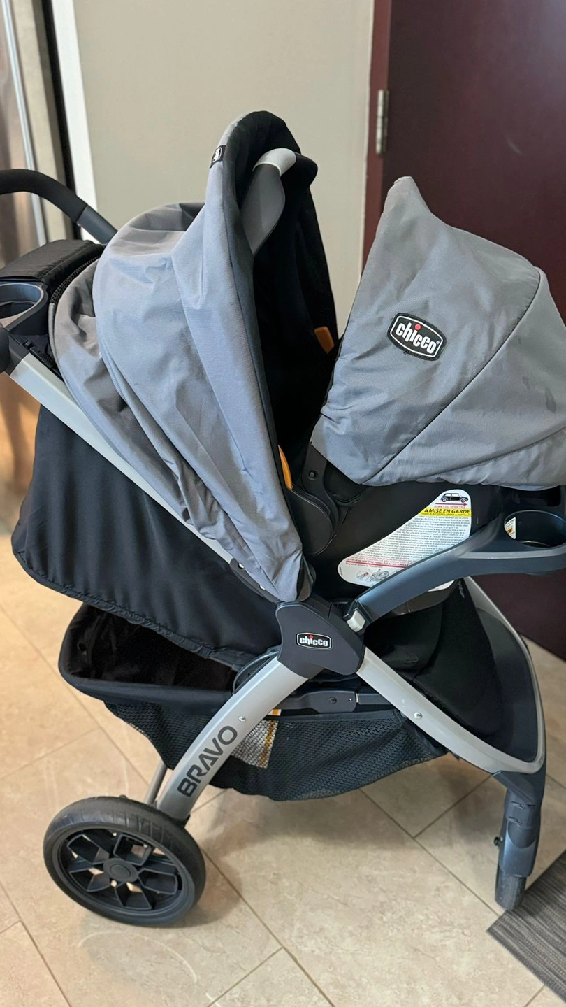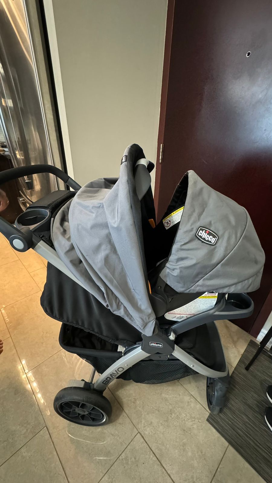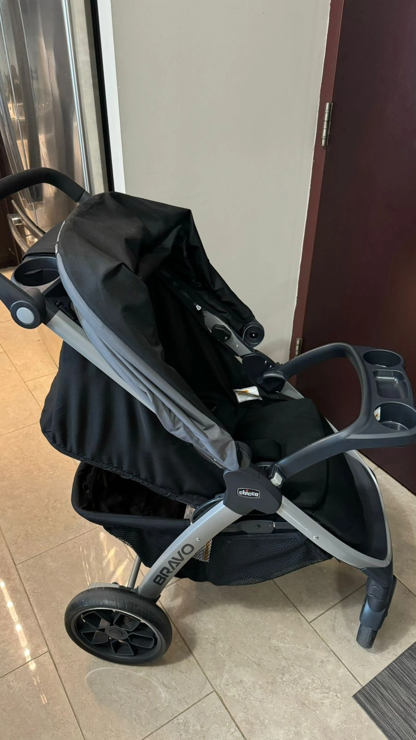 67Chicco Bravo 3-in-1 Trio Travel System, Bravo Quick-Fold Stroller with KeyFit 30 Infant Car Seat and Base, Car Seat and Stroller Combo, Camden/Black & Grey. Used but in Excellent condition. Smoke free n pet free house.