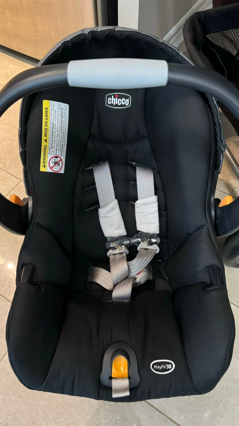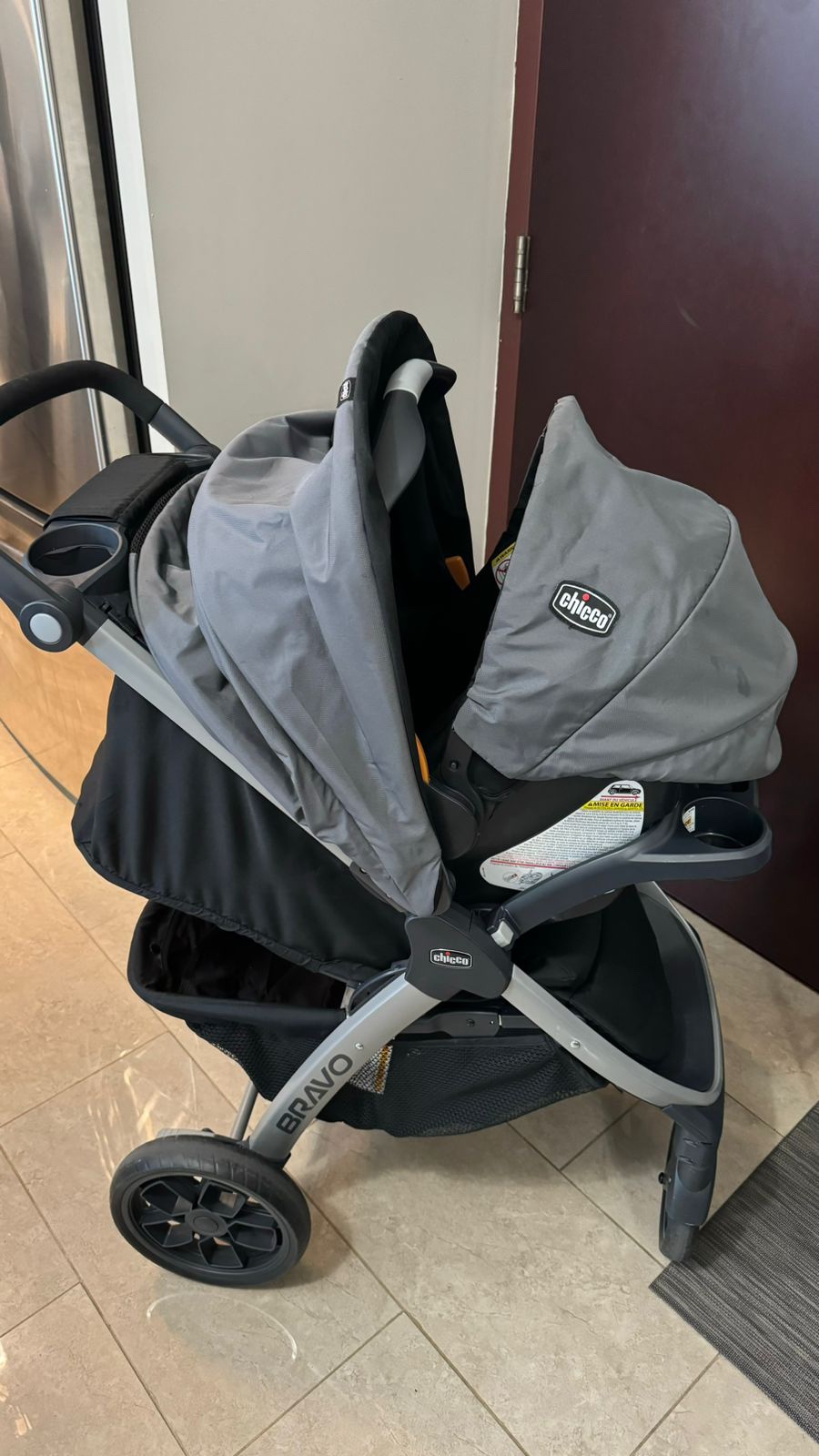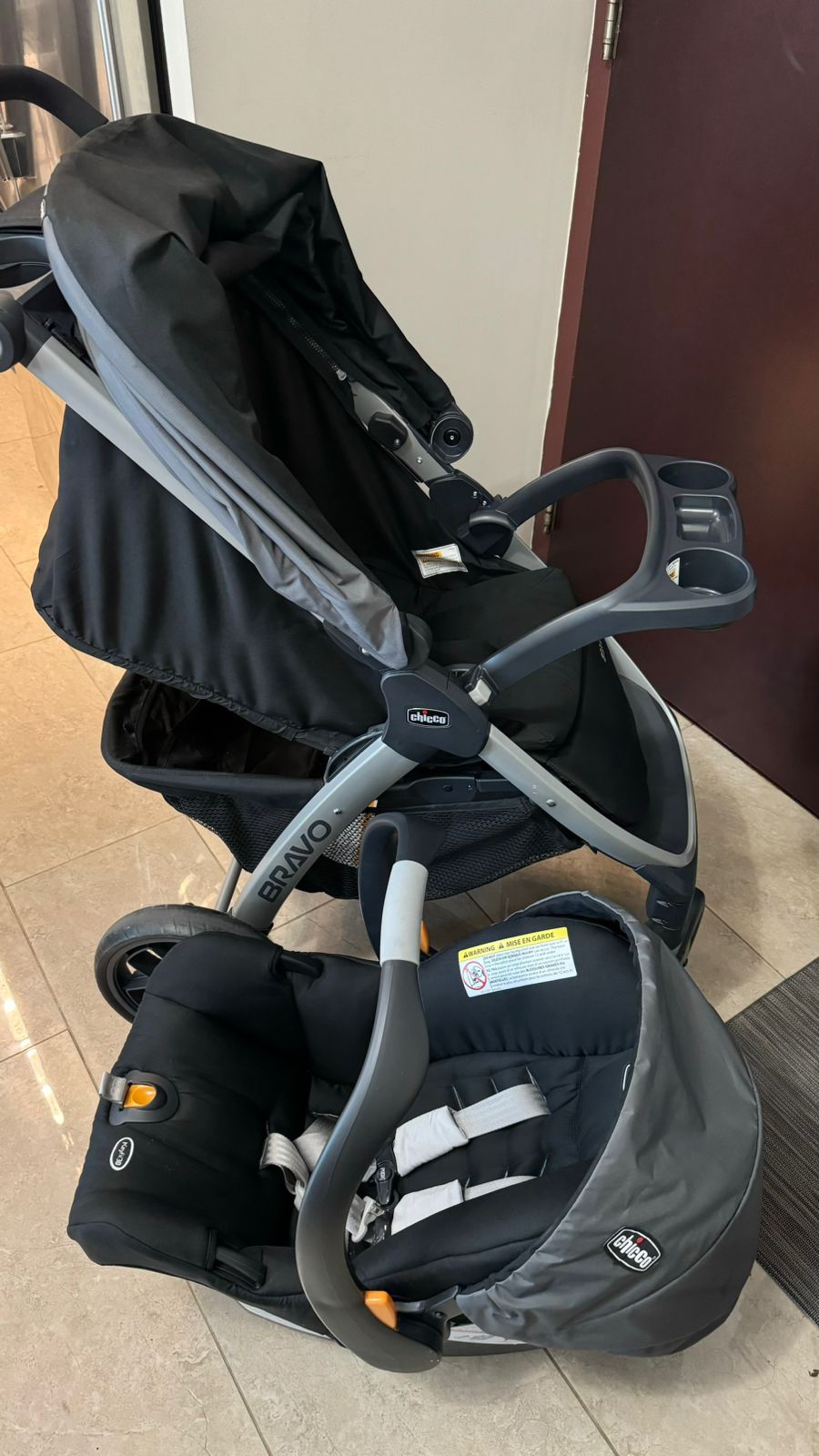67Chicco Bravo 3-in-1 Trio Travel System, Bravo Quick-Fold Stroller with KeyFit 30 Infant Car Seat and Base, Car Seat and Stroller Combo, Camden/Black & Grey. Used but in Excellent condition. Smoke free n pet free house.