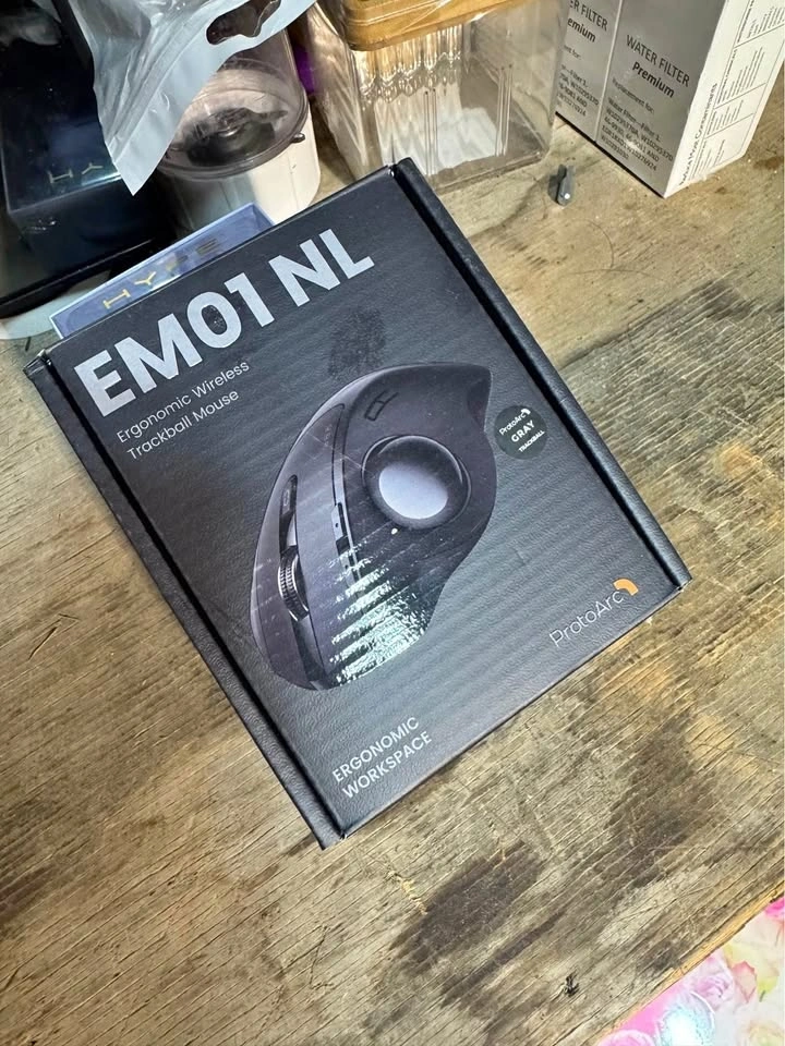 Gray with a black finish. ProtoArc EM01 NL model with a thumb-operated trackball and multiple programmable buttons. Includes a scroll wheel and DPI switch for adjustable sensitivity. Wireless connectivity for a clean workspace setup.