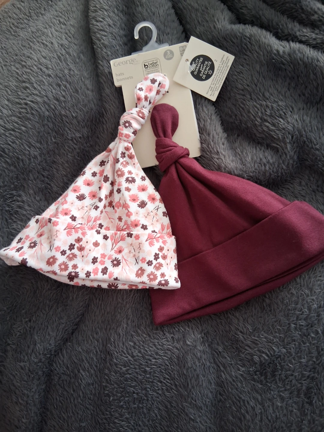 This is a two-pack of George baby hats or bonnets. One bonnet features a floral pattern in pink and white, while the other is a solid burgundy. They're made from soft fabric.