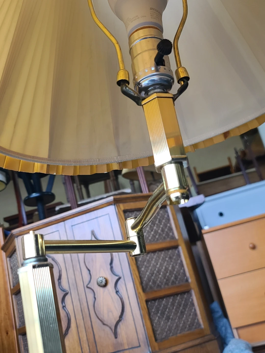 A classic brass floor lamp with a pleated beige fabric shade. It features an adjustable arm for directing light. This lamp's style suits many decors. It's a great addition for reading nooks or living rooms. Delivery can be arranged. Viewing and pickup by appointment.