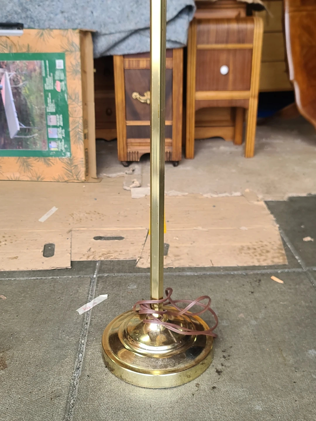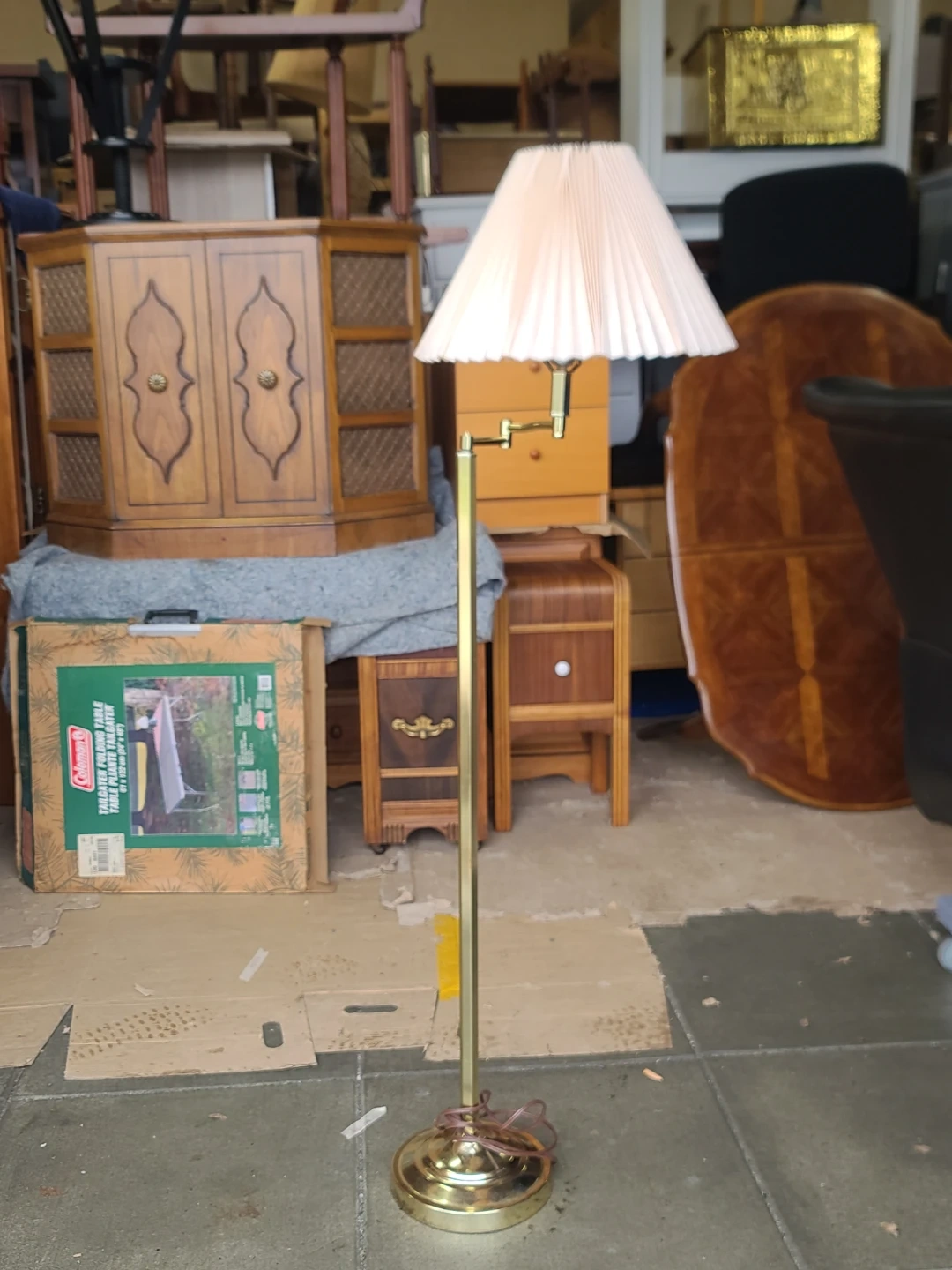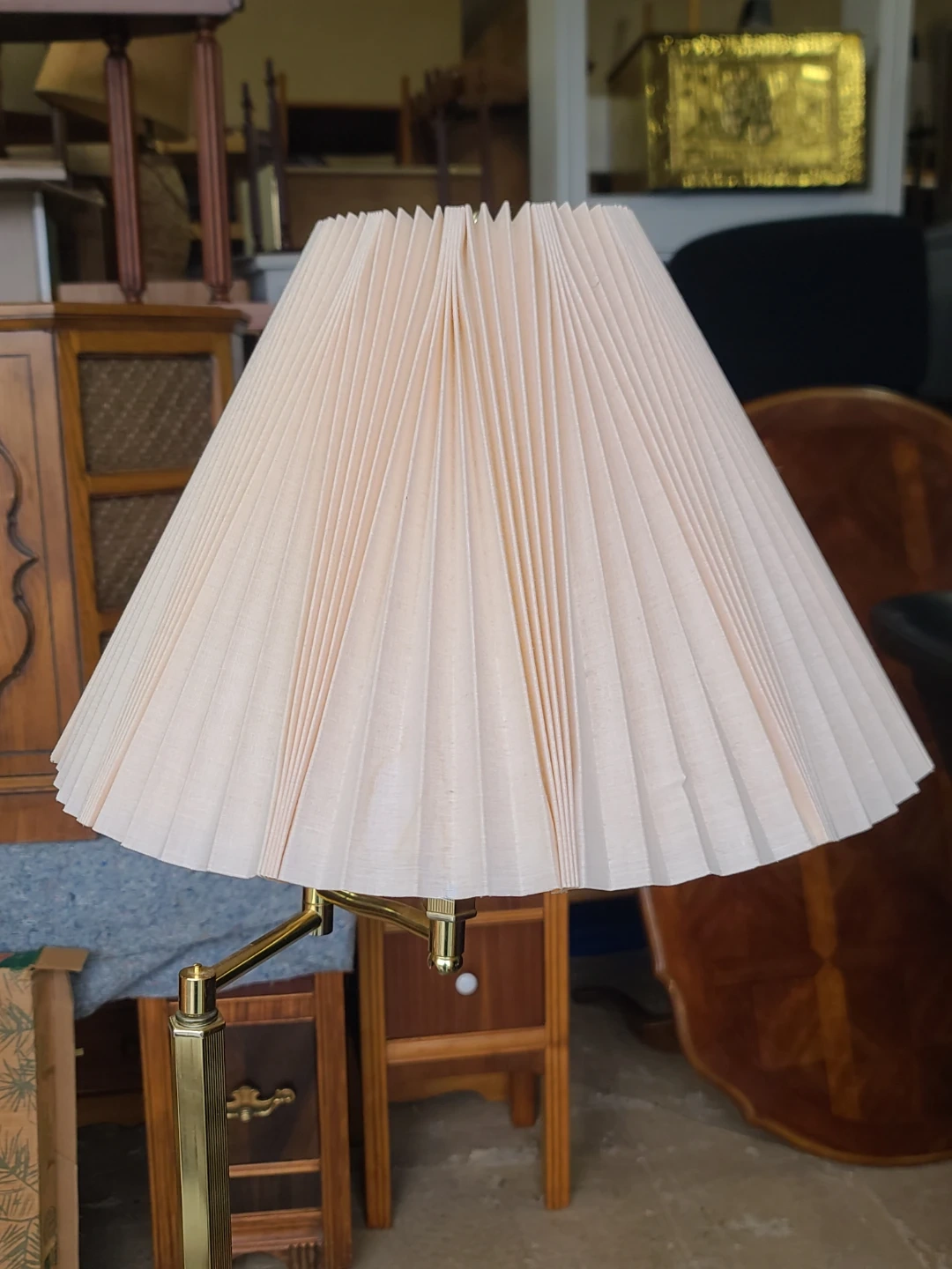 A classic brass floor lamp with a pleated beige fabric shade. It features an adjustable arm for directing light. This lamp's style suits many decors. It's a great addition for reading nooks or living rooms. Delivery can be arranged. Viewing and pickup by appointment.