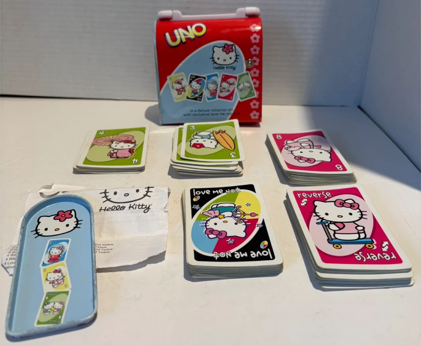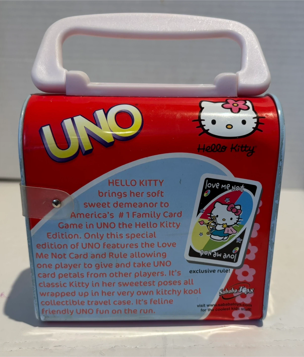 This is the Hello Kitty UNO Deluxe Collector Tin edition! It includes the UNO deck and a special "Love Me Not" card. Perfect for Hello Kitty fans and card game lovers alike. Tin has a handle for easy carrying. Vintage Hello Kitty Uno Deluxe Collector Tin Sanrio 2003 Complete w/Instructions