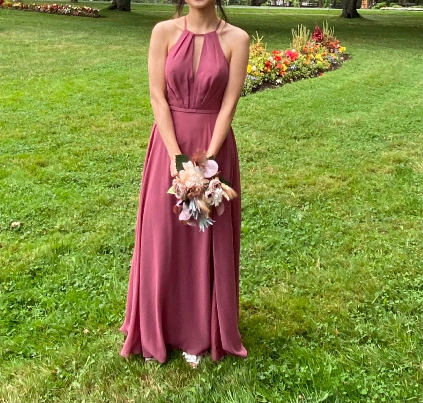 Desert rose colored floor length maxi dress with a halter neckline and a bow tie-back. A-line silhouette and one high leg slit. Flowy chiffon fabric, comfortable for weddings and events.