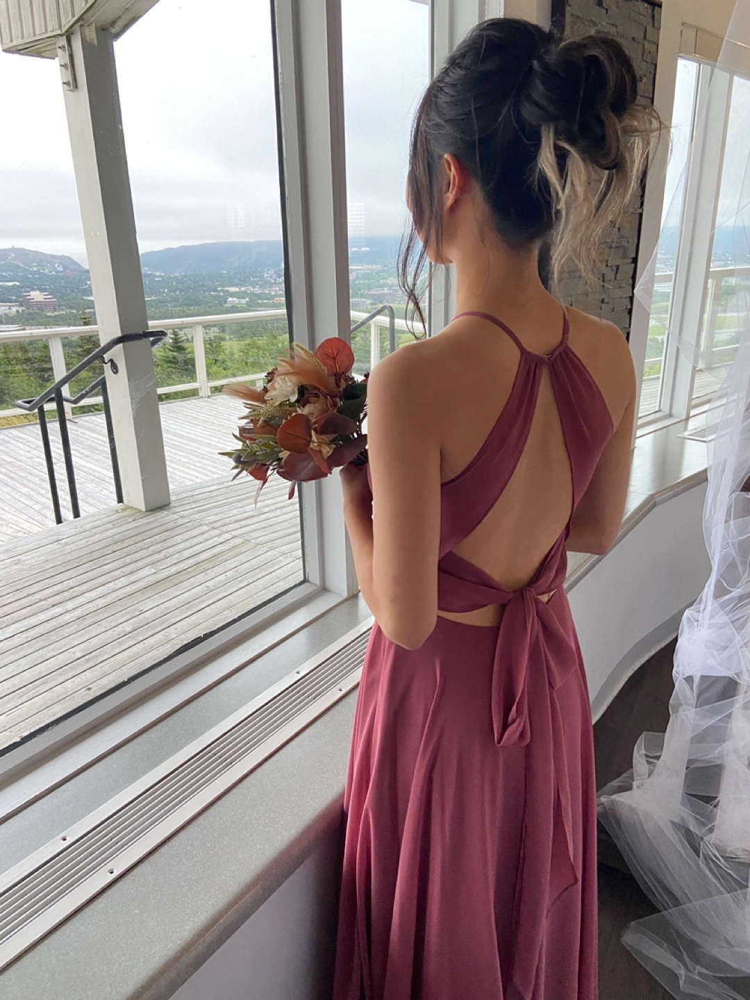 Desert rose colored floor length maxi dress with a halter neckline and a bow tie-back. A-line silhouette and one high leg slit. Flowy chiffon fabric, comfortable for weddings and events.