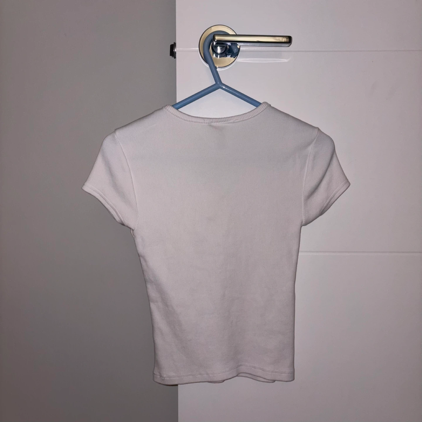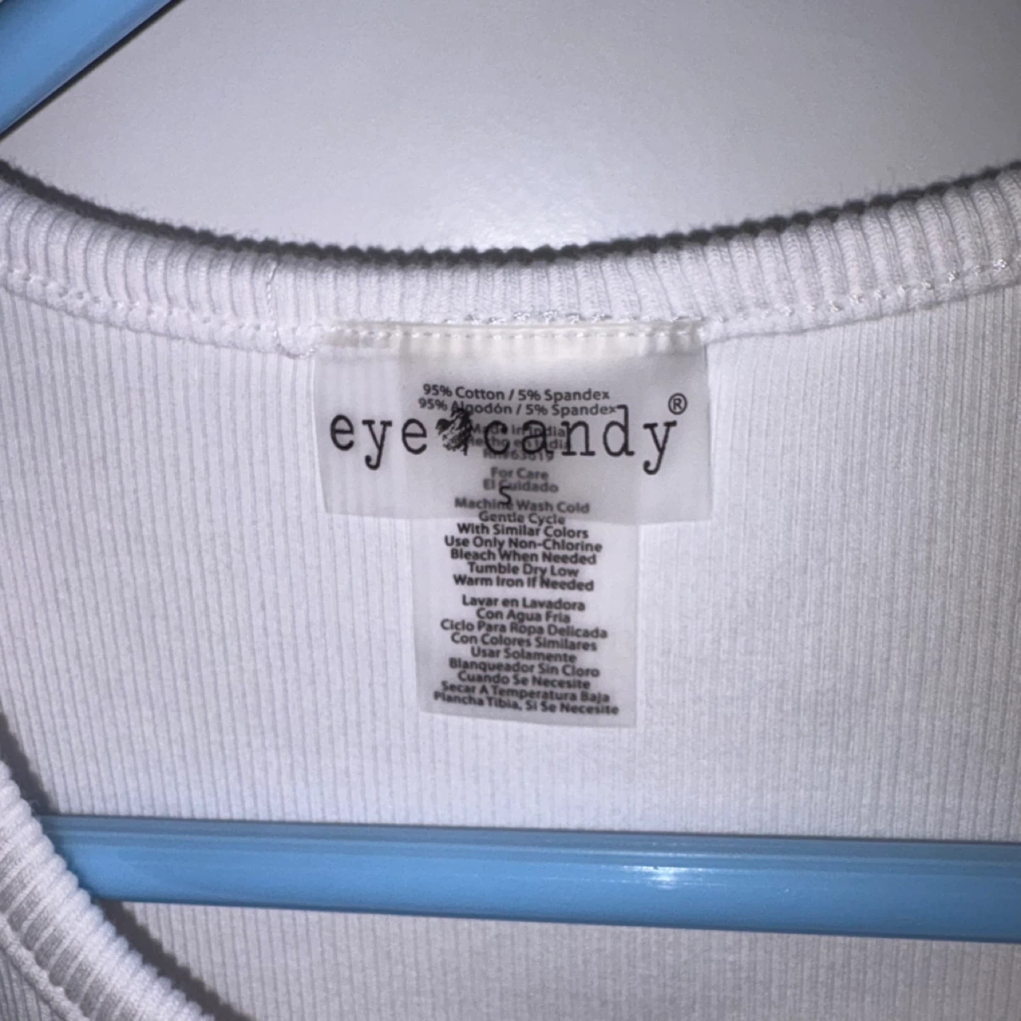 This white ribbed top is made from a 95% cotton and 5% spandex blend. It features short sleeves and a henley neckline with button details. It's a comfortable and versatile piece.
