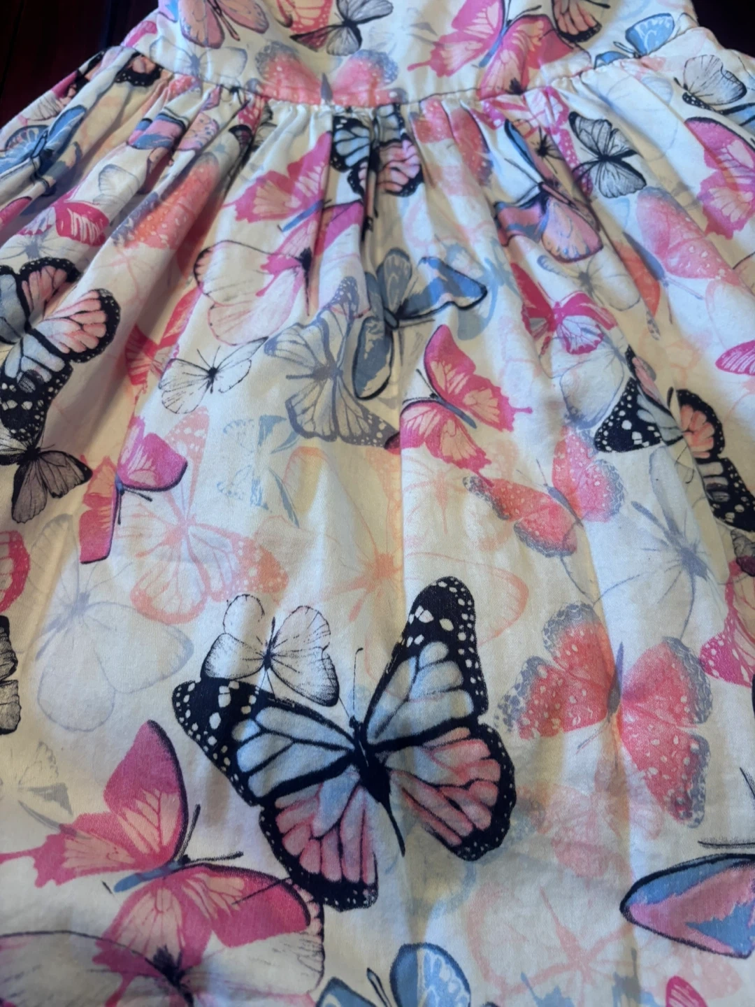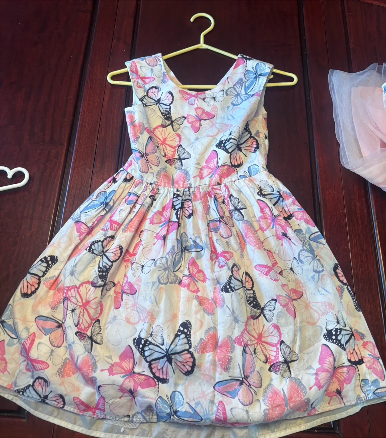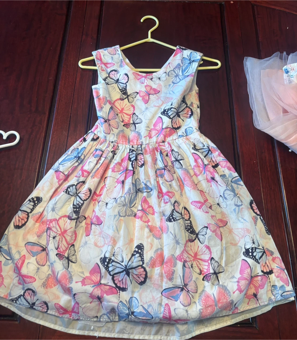 This sleeveless A-line dress features a colourful butterfly print all over. It has a scoop neckline and a full, gathered skirt with a soft tulle overlay. Perfect for parties or special occasions! Size 12 fits more like 8-10 years