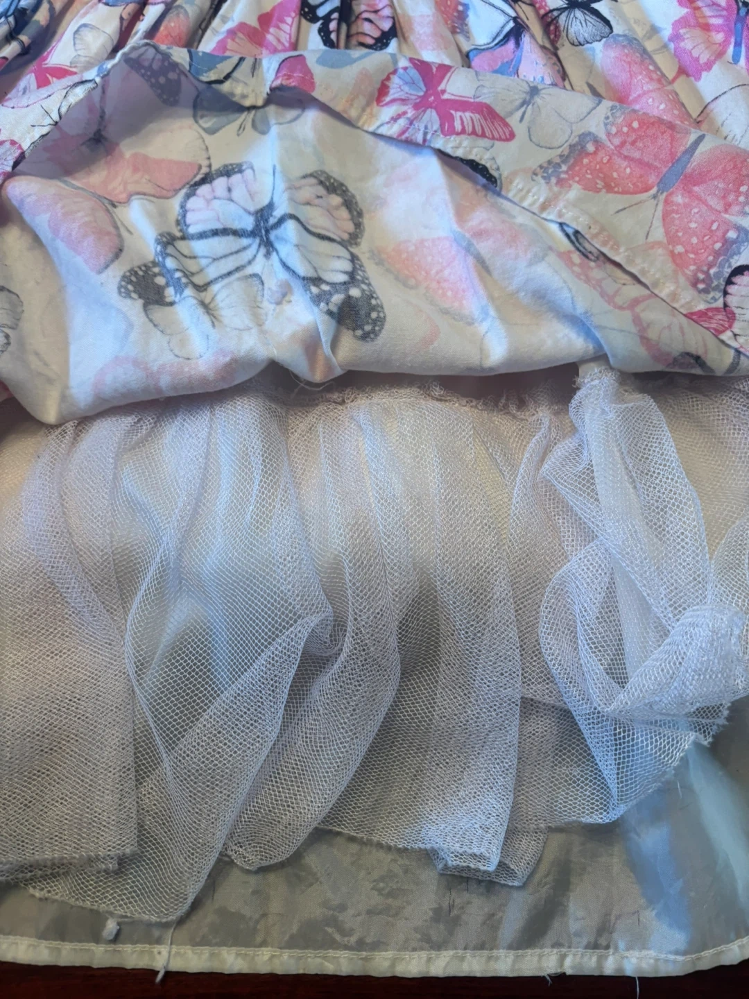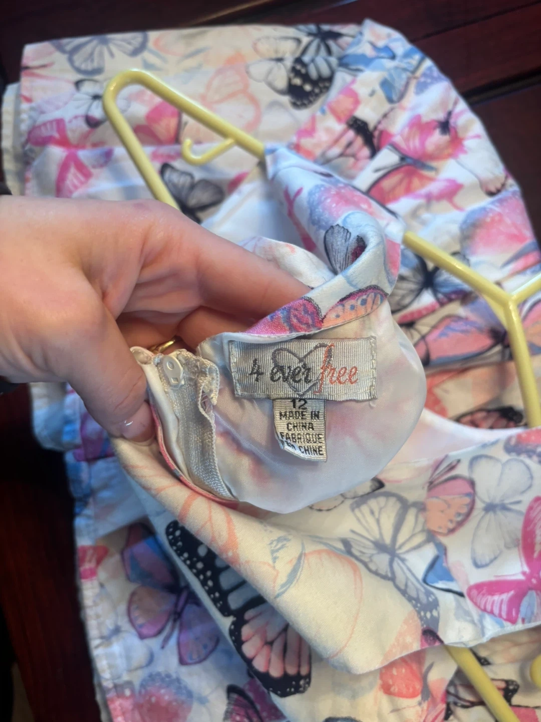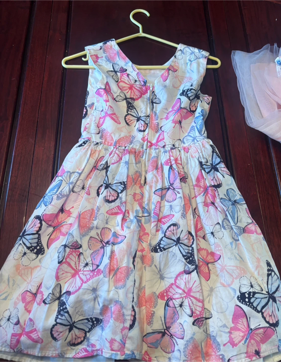 This sleeveless A-line dress features a colourful butterfly print all over. It has a scoop neckline and a full, gathered skirt with a soft tulle overlay. Perfect for parties or special occasions! Size 12 fits more like 8-10 years