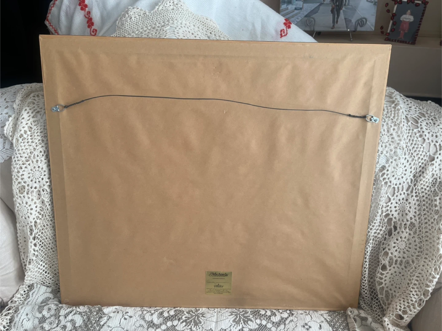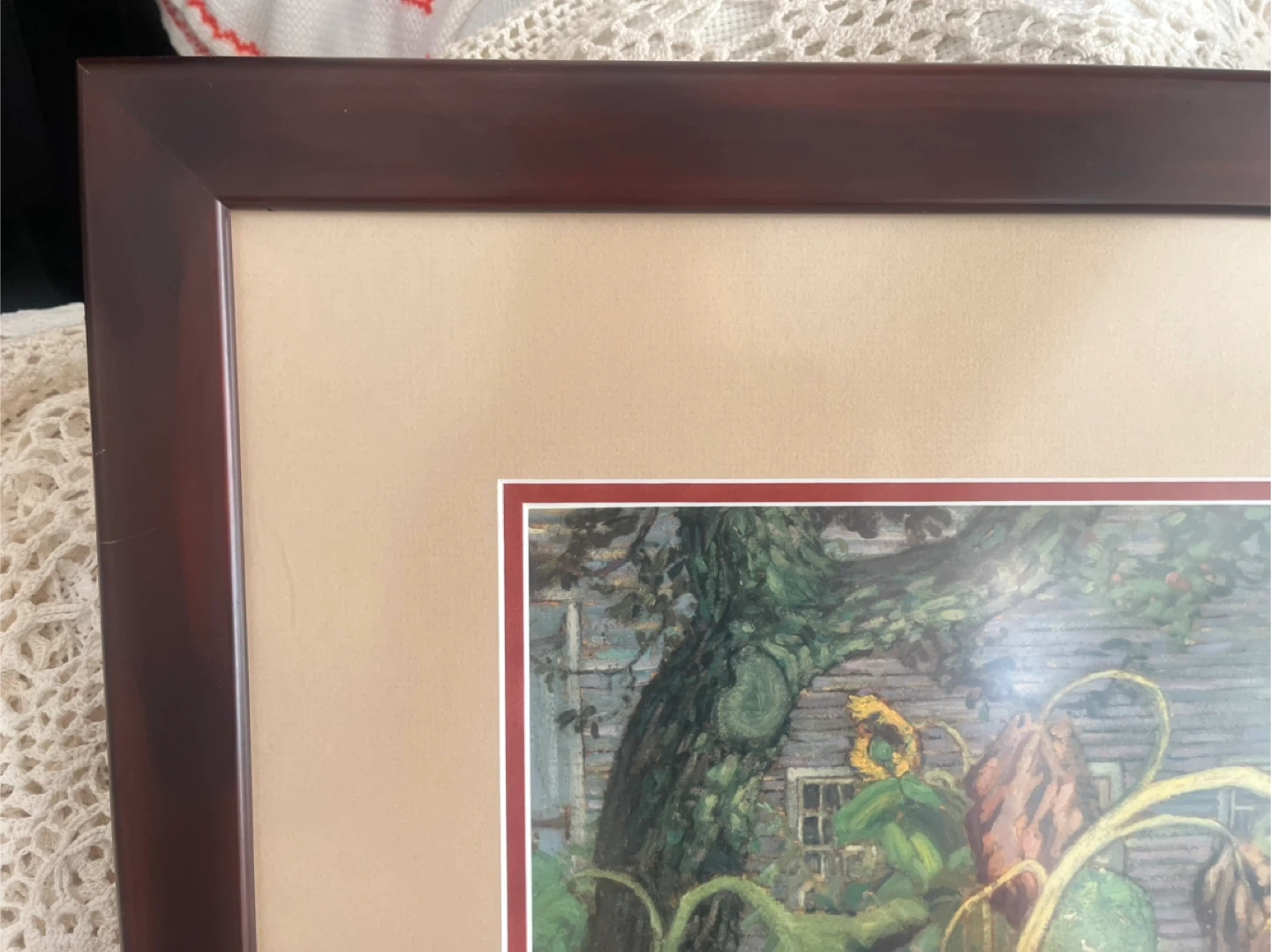 The artwork is housed in a dark wooden frame with a neutral mat. It's ready to hang with wire on the back. Dimensions are approximately 24 inches by 28 inches.