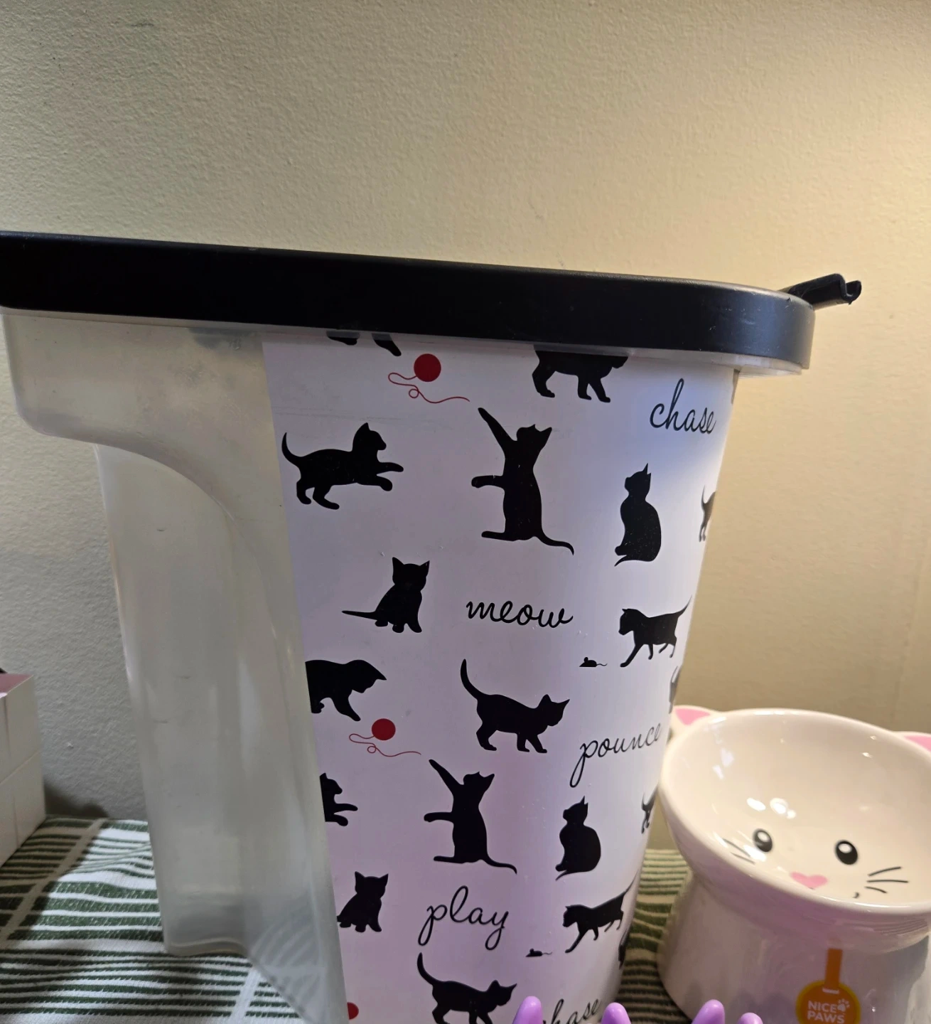 This is a Nice Paws cat food container with a cute cat design and a matching raised ceramic bowl.
