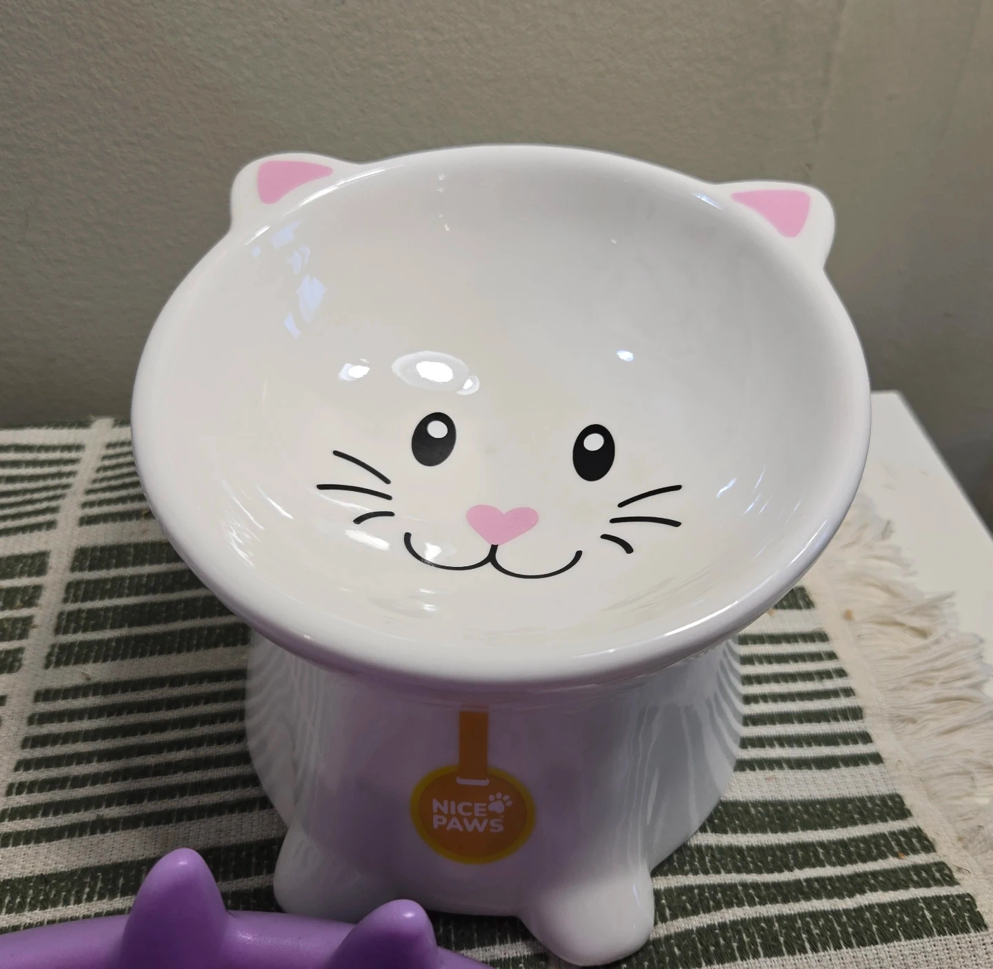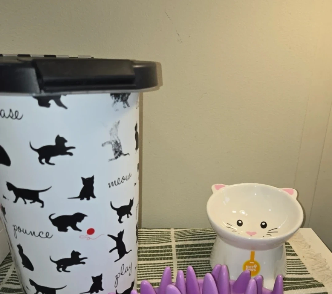 This is a Nice Paws cat food container with a cute cat design and a matching raised ceramic bowl.