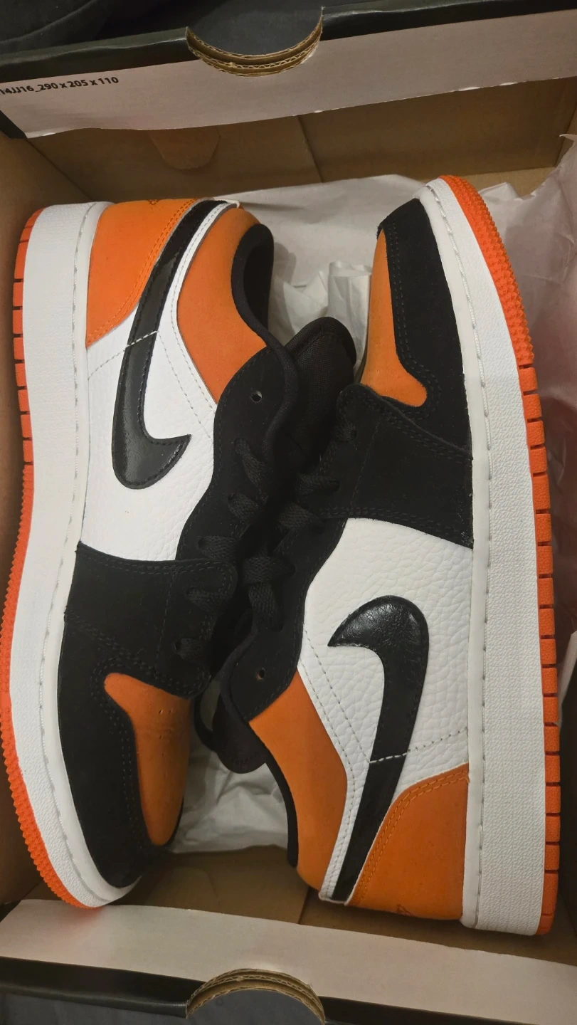 These Air Jordan 1 Low (GS) shoes come in a "Starfish" colourway. They feature a combination of black, white, and orange panelling. Includes original box. NEVER WORN‼️