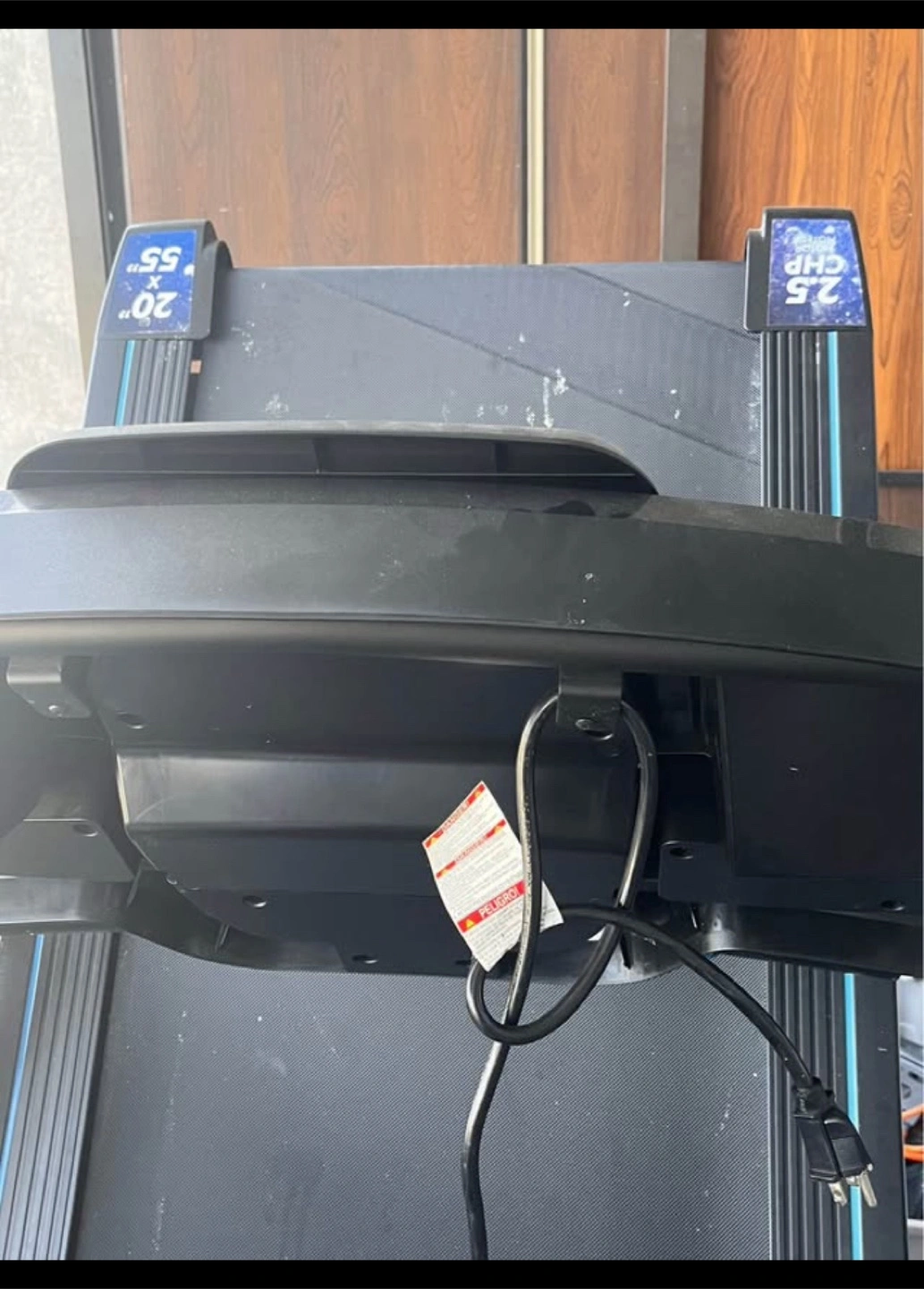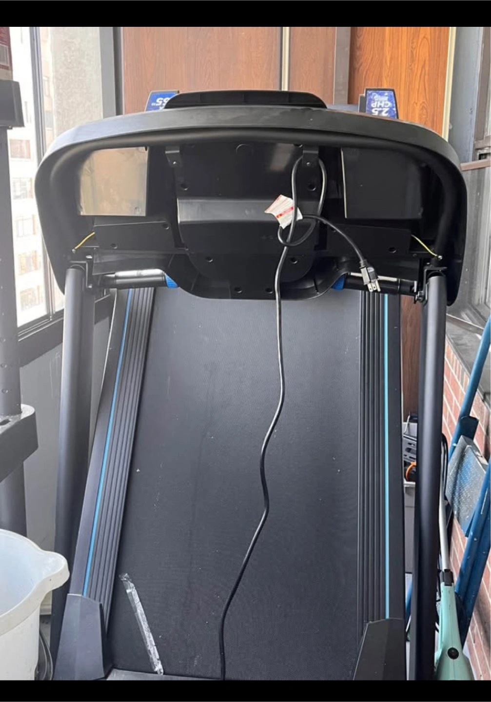 A sturdy, black treadmill. Features blue accents. The console appears to display information. Great for regular exercise at home.