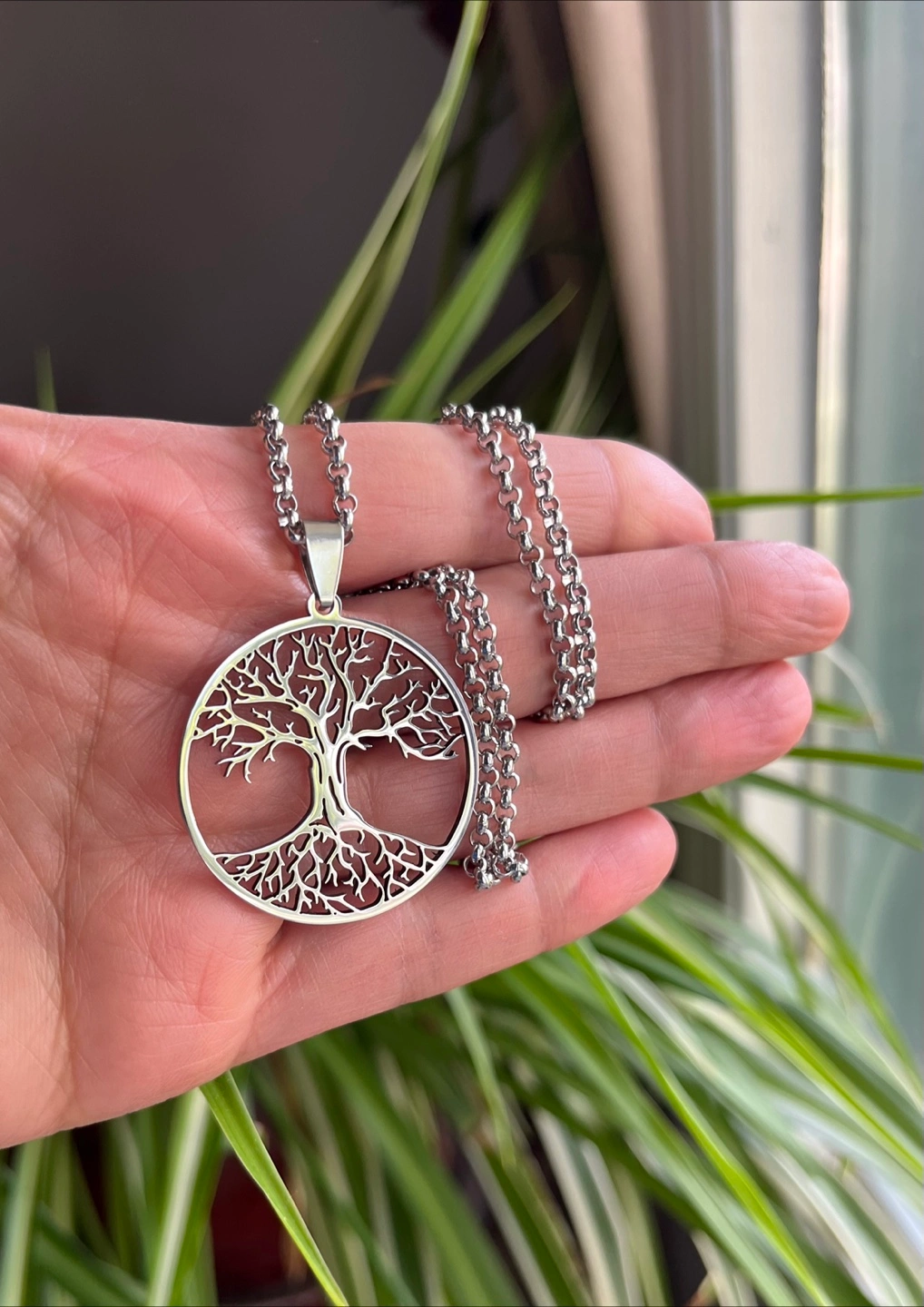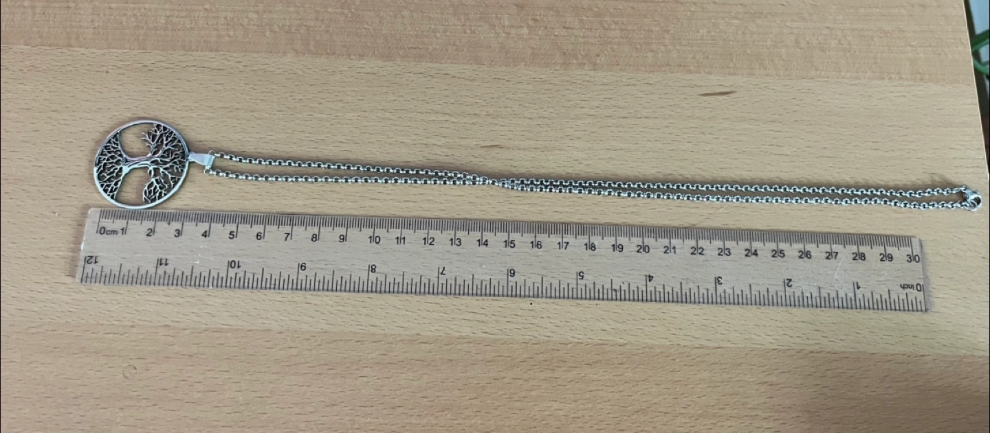 This is a lovely Tree of Life pendant necklace. It has a silver-tone finish and is in great condition. The pendant has a circular design with an intricate tree pattern inside. The chain measures approximately 30cm. Stainless steel