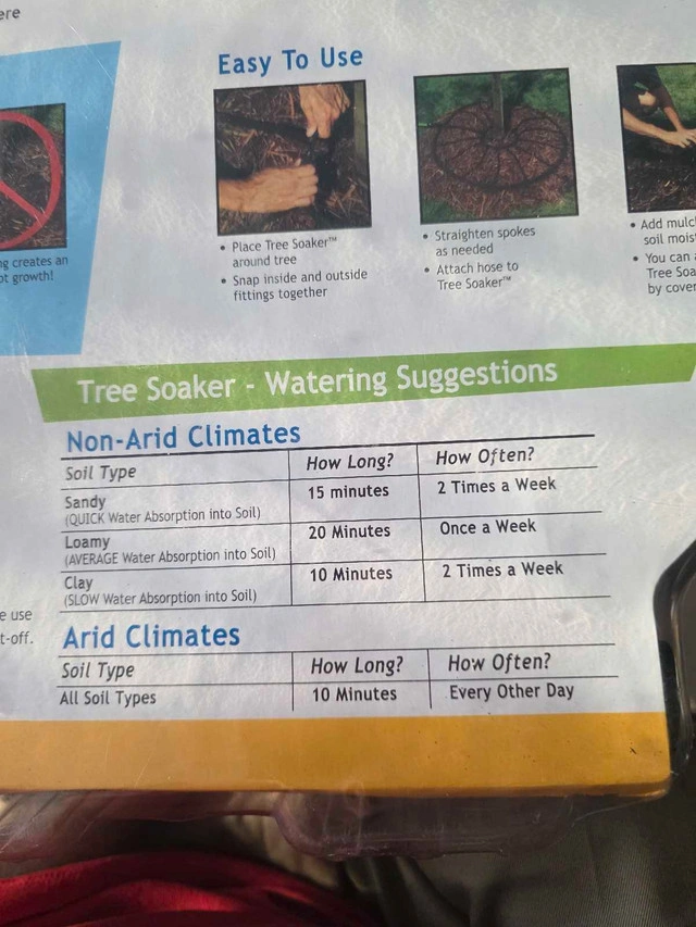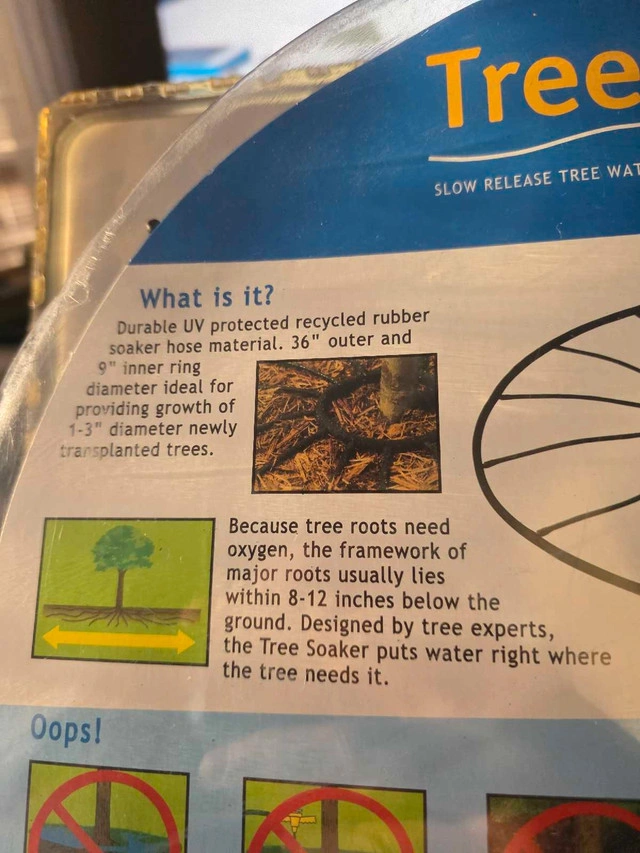 64Water your newly transplanted trees efficiently with this new Nelson Tree Soaker, a slow-release watering ring designed to protect your investment, save time and water, and maximize growth. This soaker is ideal for new trees with a 1-3" trunk diameter and transplanted trees with a 1-3" trunk diameter. Designed for use with both arid, and non-arid climates, use this soaker to ensure your trees get just the right amount of water. Key Features: * Durable UV protected recycled rubber soaker hose material. * 36" outer and 9" inner ring diameter. * Ideal for providing growth of 1-3" diameter newly transplanted trees. This unique soaker will have your trees singing in the rain, even when the sun is shining. If the ad is up, it's still available!