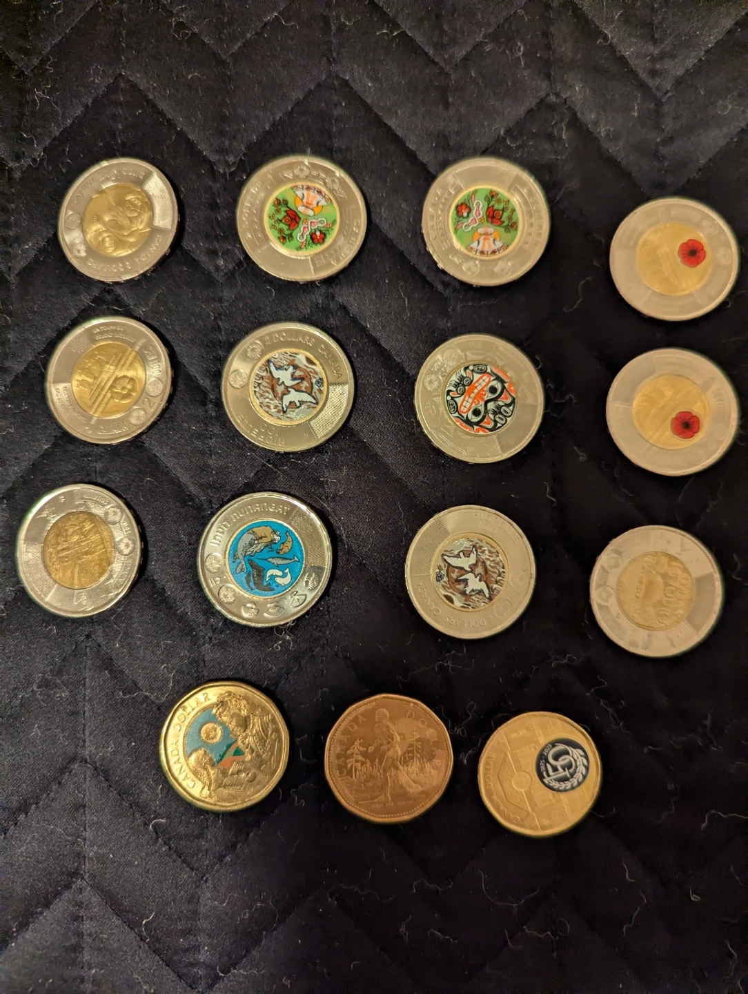 Small collection of Canadian coins, includes 12 toonies and 3 loonies.