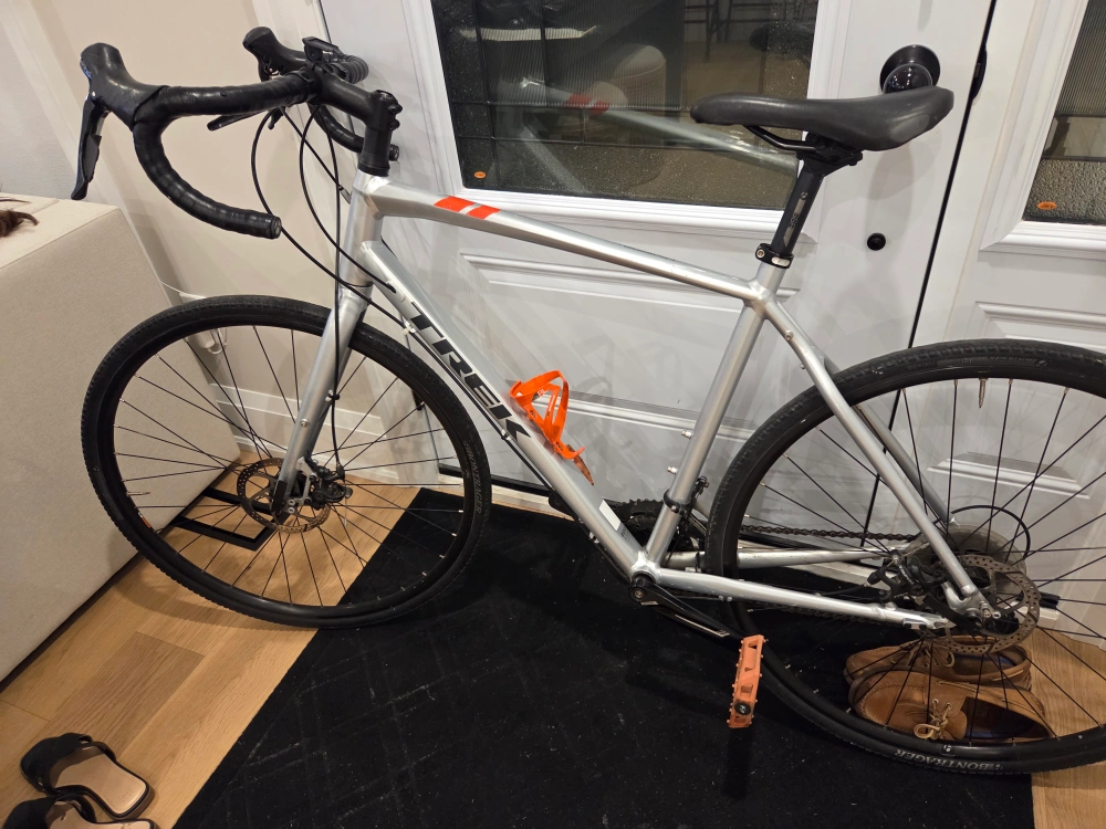 Selling a Trek Crossrip 1 gravel bike in silver. It's a great bike for both on and off-road adventures! The frame is in good condition and ready for a new owner. 58CM (large)