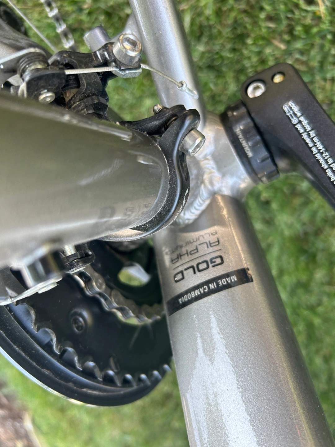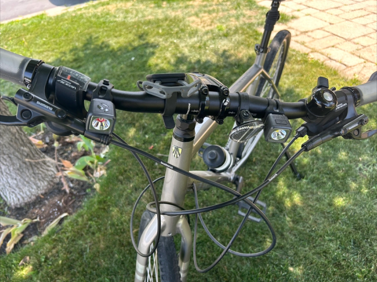 A silver bicycle. Features black tires and a black seat. Handlebars appear to have lights. A great choice for peaceful weekend rides.