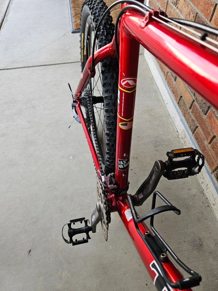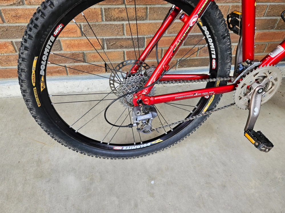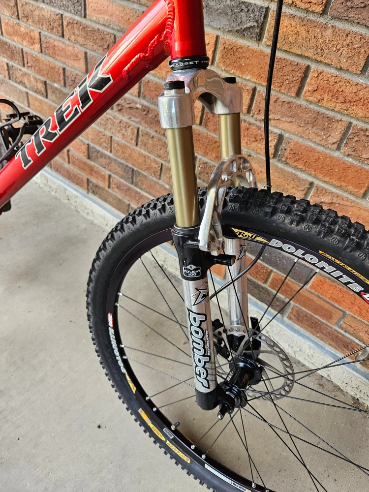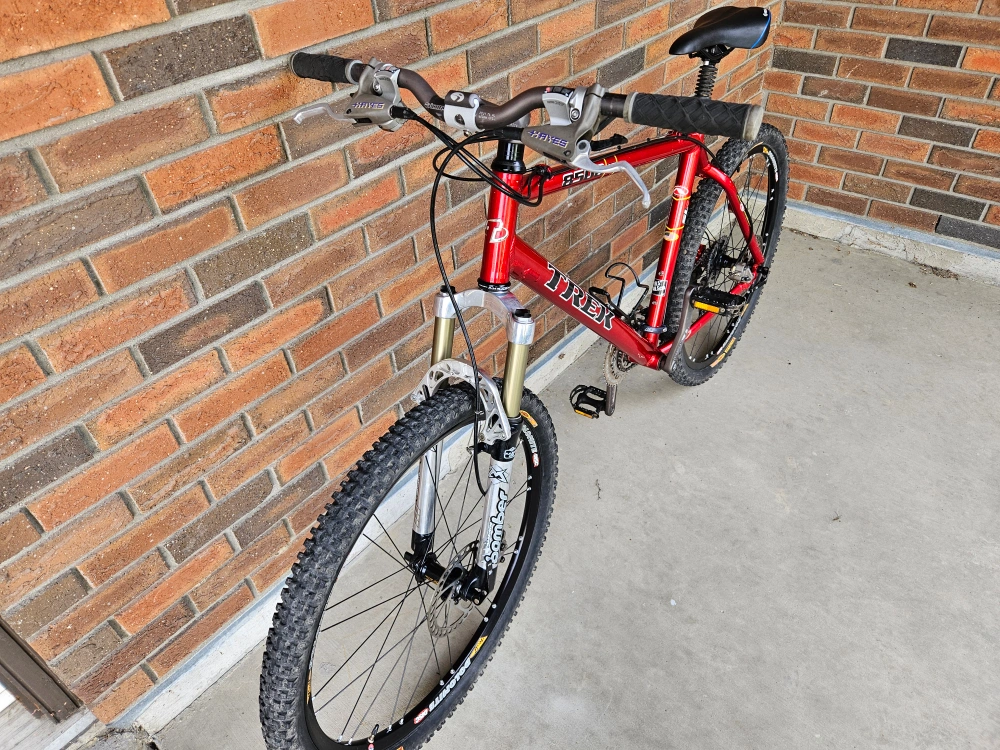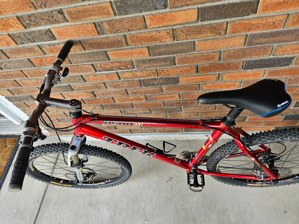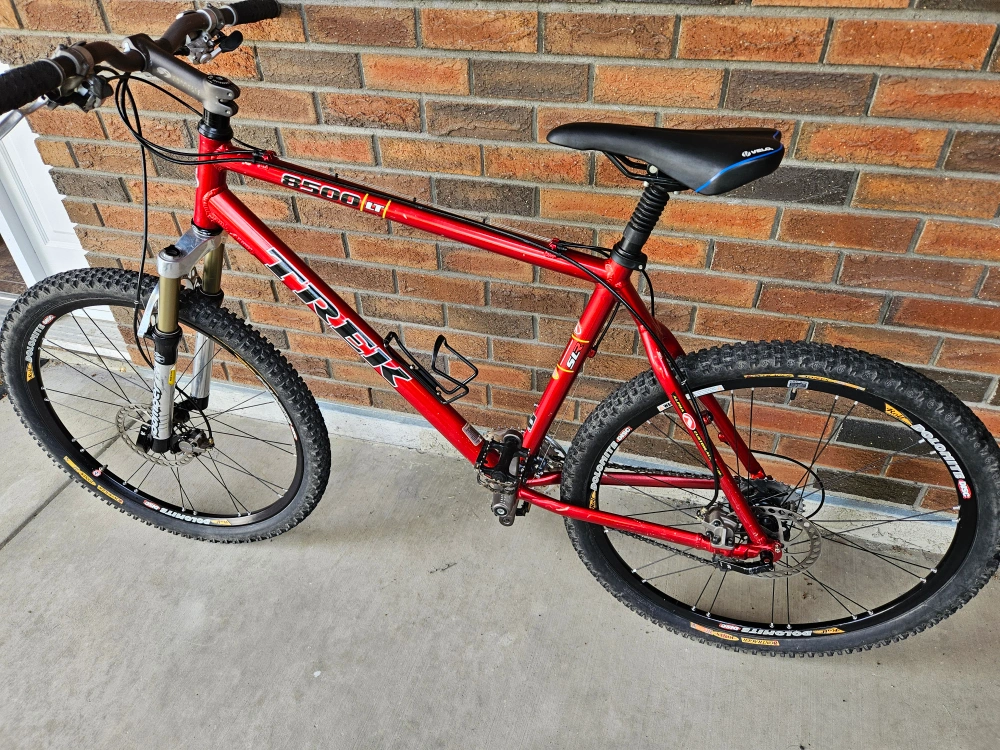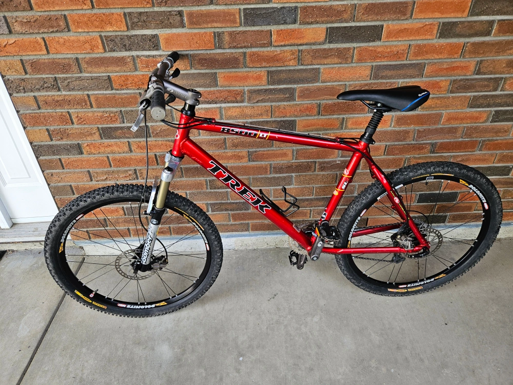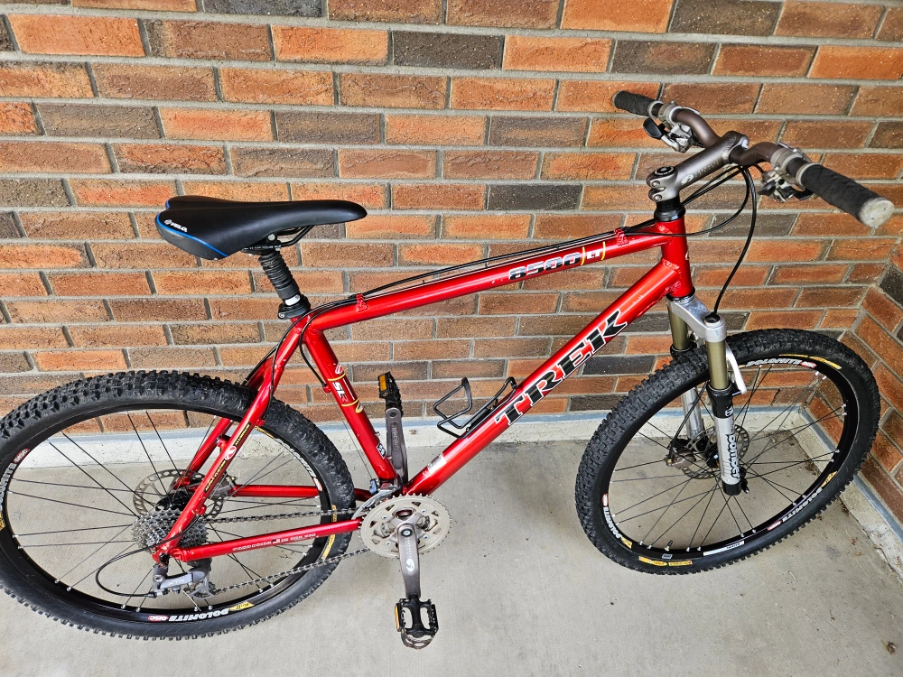 Road, Gravel & Light Trail Classic Trek 8500LT Aluminum frame with quality components. Frame size 19.5"/49.5cm. Very light bike, 13kgs - 26" Rolf Dolomite Disc Wheels, 26" x 2.1" Bontrager Jones Tires. - Marzocchi Bomber Front Fork Suspension. Shock Absorber Seat Post. - Icon Graphite Series Handlebars and Cranks. - Shimano XTR Derailleur with 9x3 Drive Train. - Hayes Hydraulic Disc Brakes, - Rear brakes not working, need replacement. Bike is in very good condition and a great ride. Pickup in Glenmore