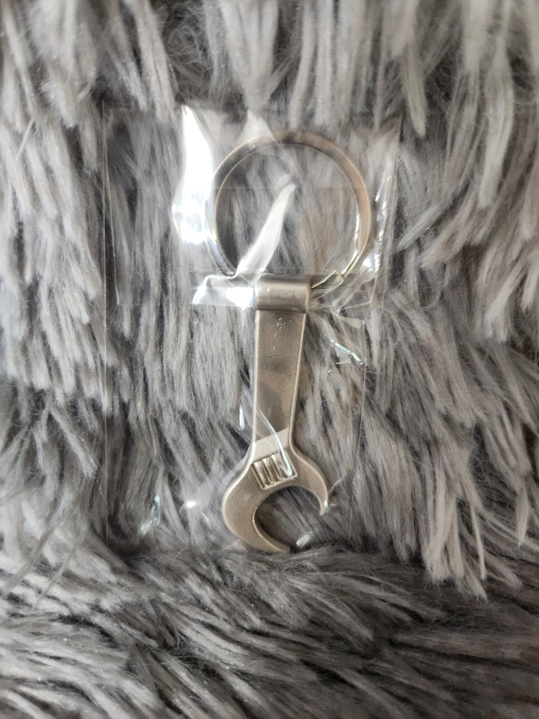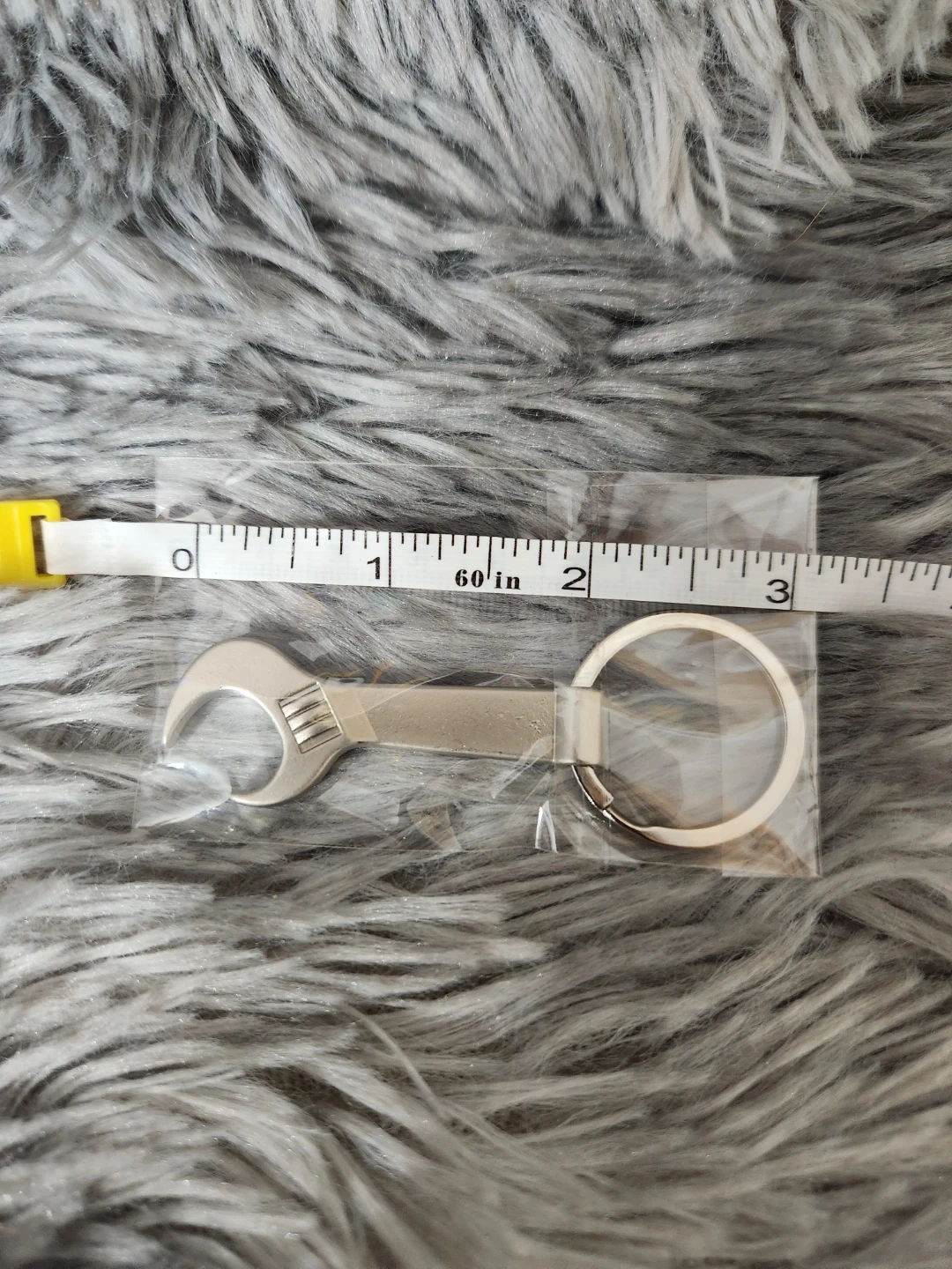 This keychain features a miniature wrench that's a bottle opener. It's made of metal and comes attached to a keyring. The wrench itself measures approximately 2 inches long.
