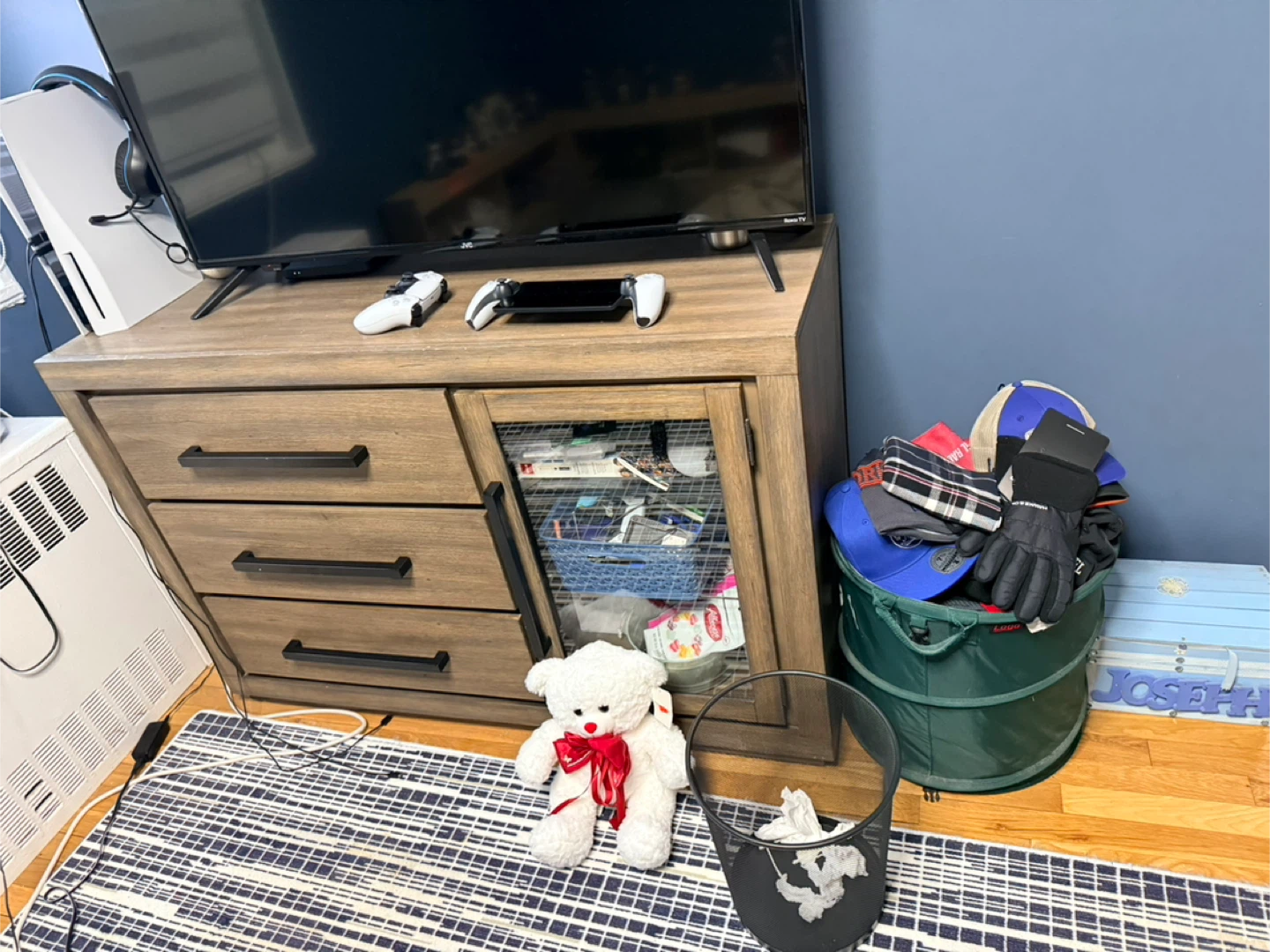 This wooden dresser features three drawers and a glass-door cabinet for storage. It has a light wood finish with black metal handles. Perfect for organizing clothing or home essentials. Dimensions: 48" W x 18" D x 32" H.