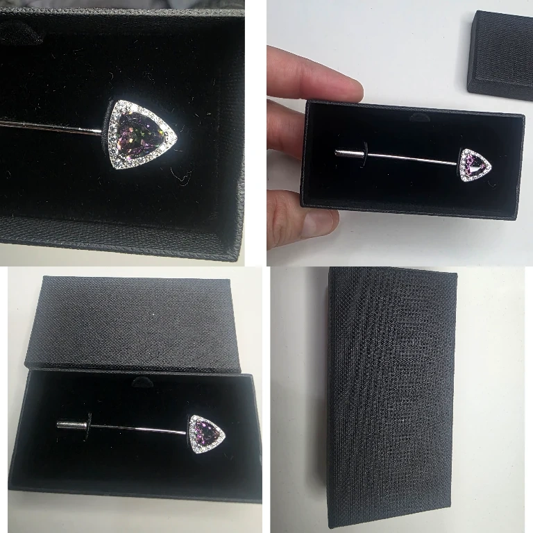 Selling a pin featuring a triangle-shaped stone surrounded by smaller stones. It comes in its original box, making it perfect as a gift or a stylish addition to your wardrobe
