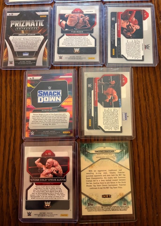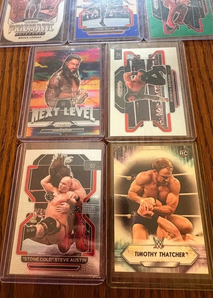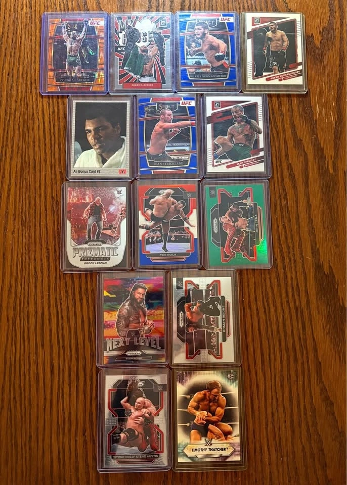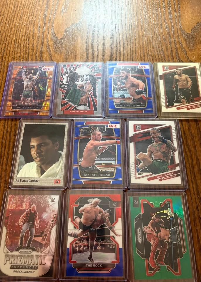 Selling a mixed UFC and WWE card lot featuring several big names in combat sports and wrestling. Includes: Conor McGregor (Select + My House insert), Khabib Nurmagomedov (Select + Donruss), Sean O’Malley, Sean Strickland, Muhammad Ali Bonus Card #2, Brock Lesnar (Prizmatic Entrances), The Rock, John Cena (Green Parallel), Roman Reigns (Next Level Prizm + insert), Stone Cold Steve Austin, Timothy Thatcher RC. All cards are sleeved and in good overall condition. Some may have minor surface or edge wear typical of modern cards, but nothing major. Great lot for UFC and WWE collectors or fans of combat sports legends.