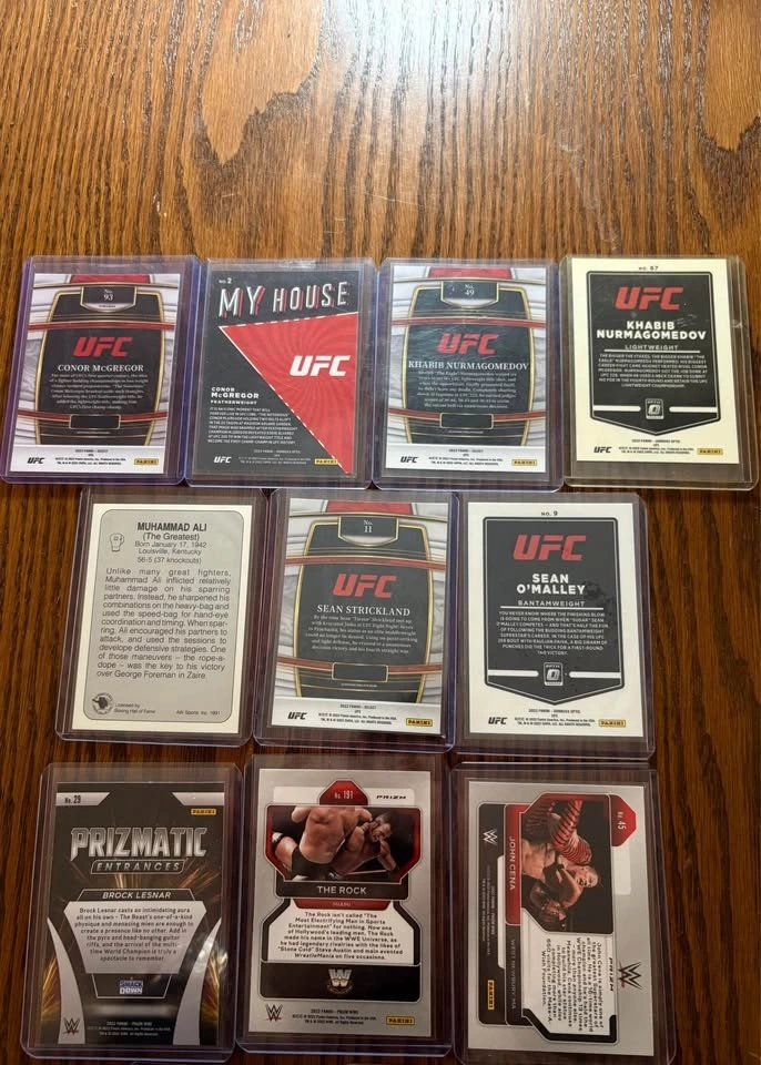 Selling a mixed UFC and WWE card lot featuring several big names in combat sports and wrestling. Includes: Conor McGregor (Select + My House insert), Khabib Nurmagomedov (Select + Donruss), Sean O’Malley, Sean Strickland, Muhammad Ali Bonus Card #2, Brock Lesnar (Prizmatic Entrances), The Rock, John Cena (Green Parallel), Roman Reigns (Next Level Prizm + insert), Stone Cold Steve Austin, Timothy Thatcher RC. All cards are sleeved and in good overall condition. Some may have minor surface or edge wear typical of modern cards, but nothing major. Great lot for UFC and WWE collectors or fans of combat sports legends.
