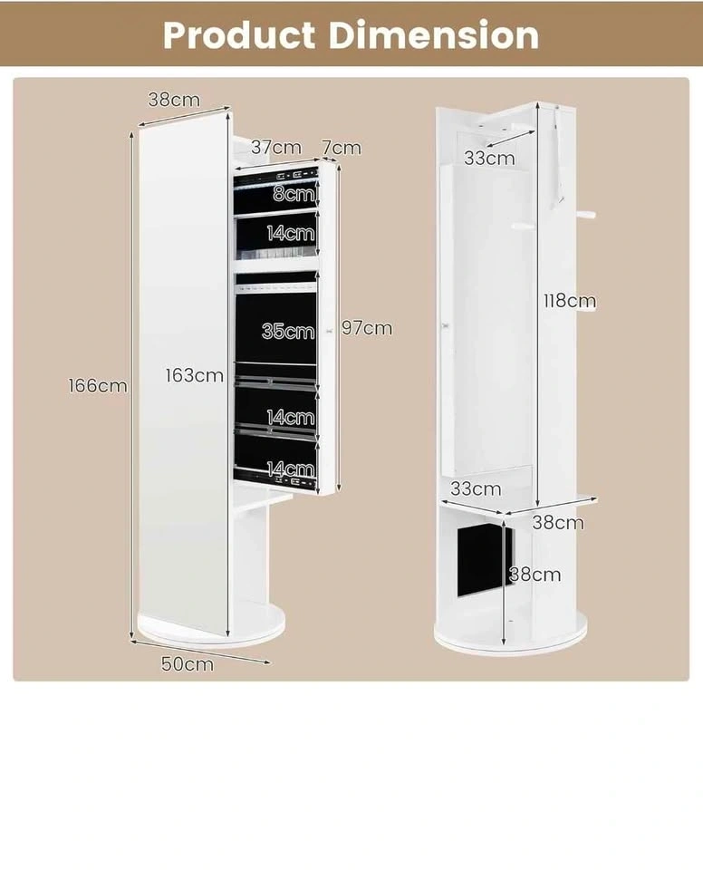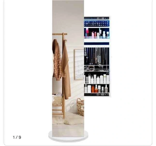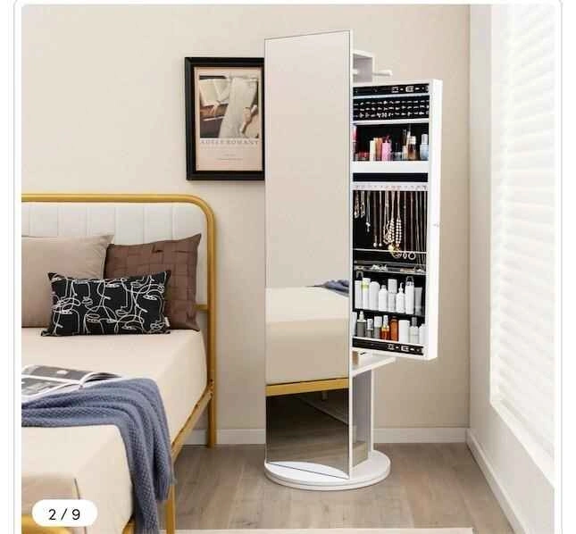 Elevate your organization with the Costway 2 Shelf White Swivel Mirrored Jewellery Storage Cabinet. This stylish cabinet features a sleek, modern design that seamlessly fits into any decor. The swivel feature offers easy access to your jewelry and beauty products while ensuring they remain neatly stored. The mirrored front adds a touch of elegance and serves as a functional full-length mirror. Inside, it includes spacious storage compartments, perfect for keeping necklaces, earrings, and cosmetics organized and within reach. With its versatile design, this cabinet is not just a storage solution but also an eye-catching addition to your space. BNIB