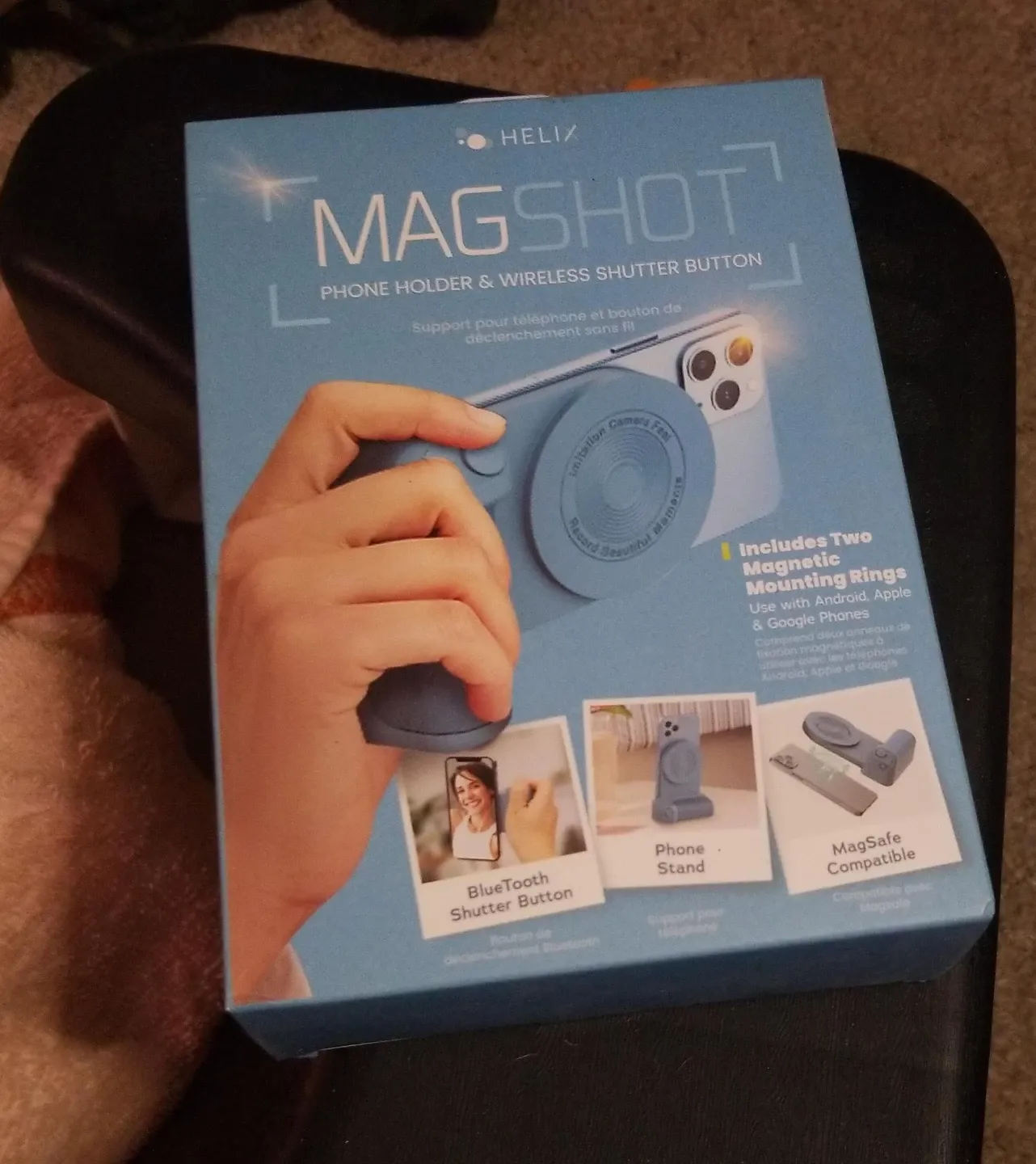 This HELIX Magshot is a phone holder and wireless shutter button. It includes two magnetic mounting rings for use with Android, Apple, and Google phones. It's also MagSafe compatible.