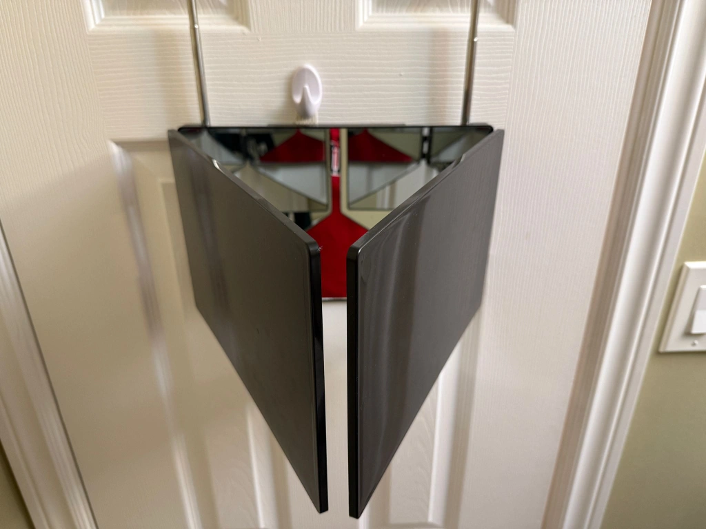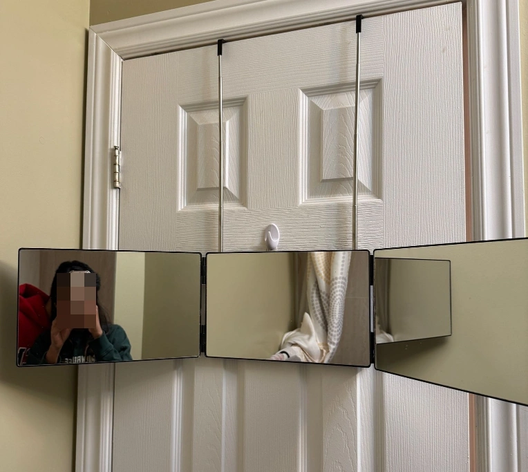 24Portable tri-fold mirror. Hangs over the door. Adjustable height. Great for makeup, haircut and beard cutting.