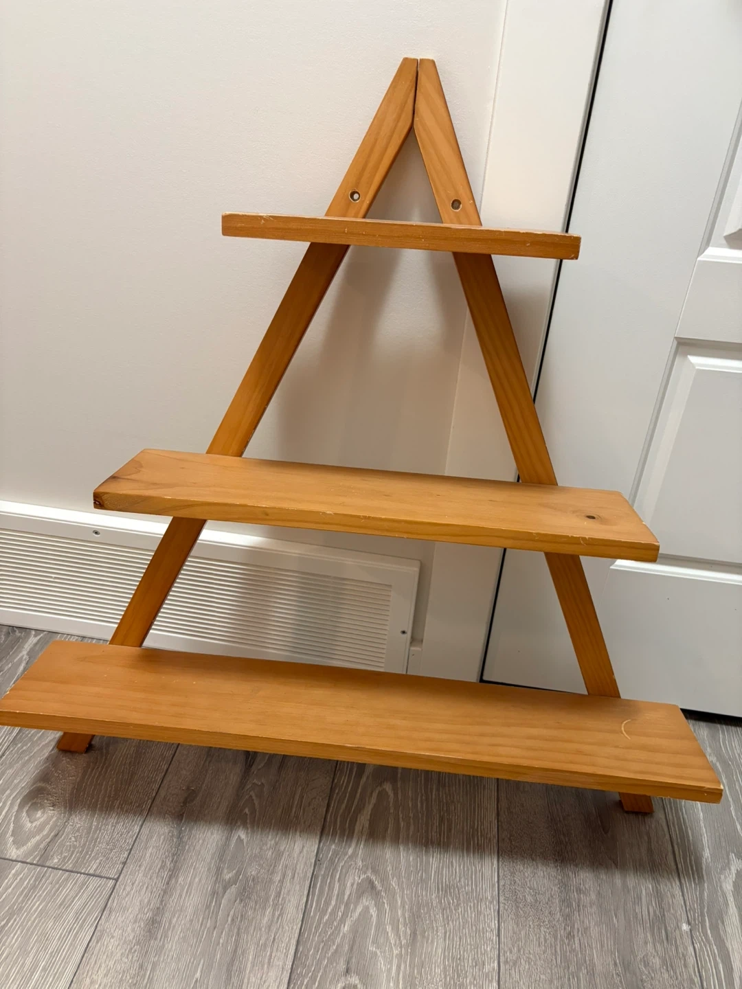 Selling a wooden shelf. It's a great piece for displaying items or adding a rustic touch to your space. It has three shelves, perfect for plants, books, or decor 29” high 27” at longest point