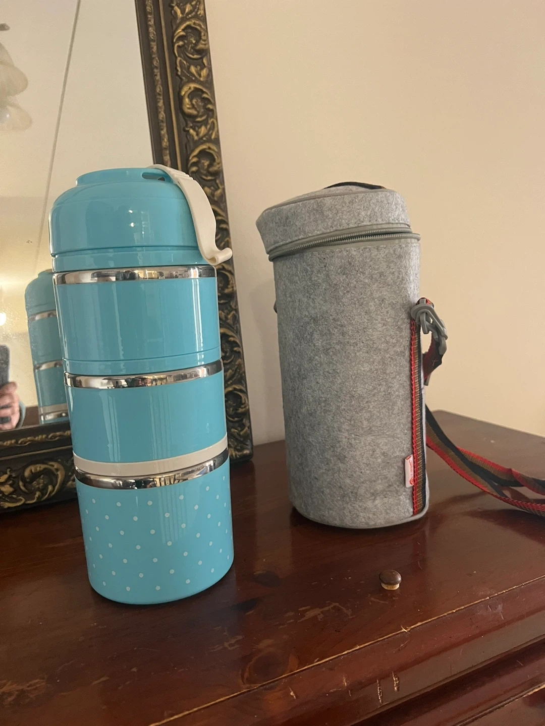 This is a stackable lunch box with a cute light blue design! It's made of stainless steel and comes with a grey carrying case. Perfect for taking your lunch to work or school