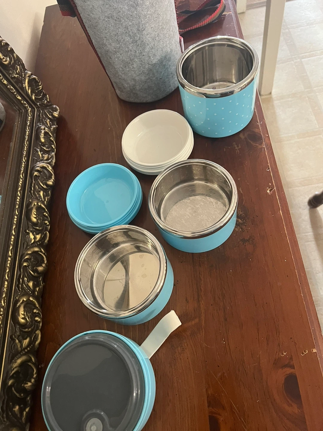 This is a stackable lunch box with a cute light blue design! It's made of stainless steel and comes with a grey carrying case. Perfect for taking your lunch to work or school