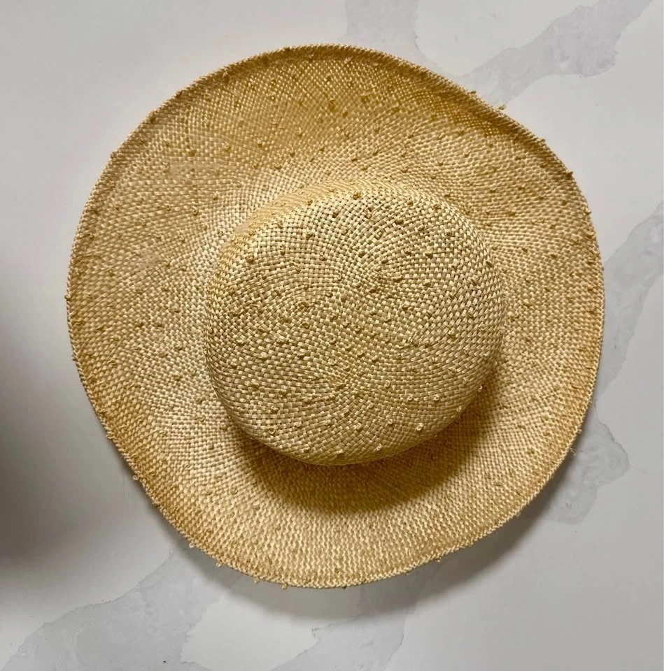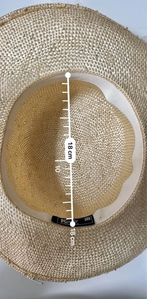 Stylish straw hat from Kates Canada with a wide brim. Total diameter is 32 cm. Inner head opening is 18 cm. Great for sunny days.