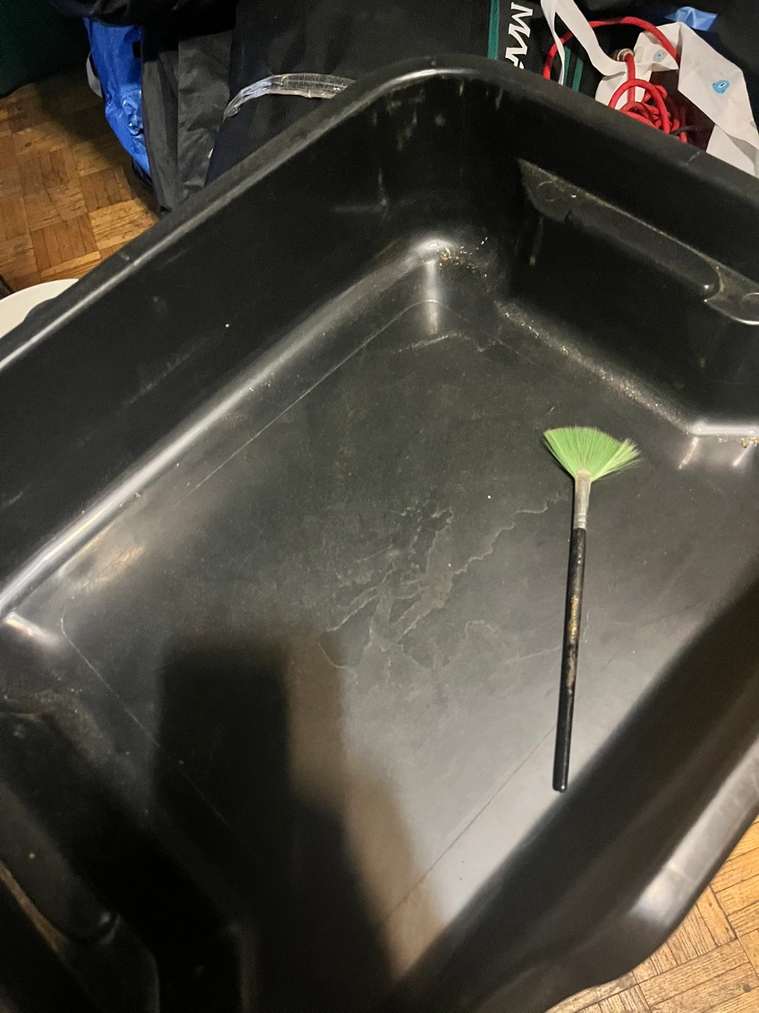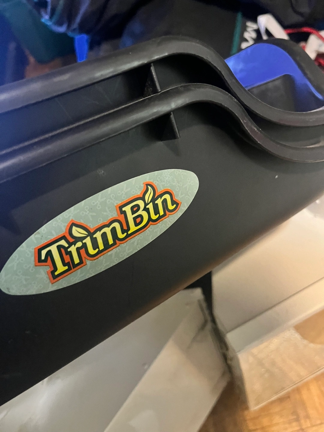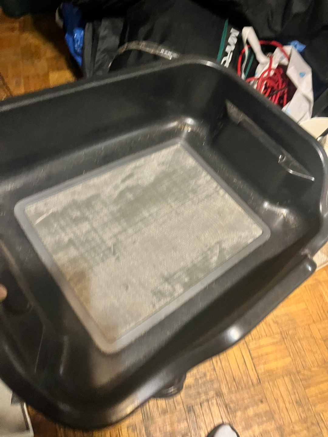 Large black plastic storage container. Features a removable grey mesh insert. Some minor scuffs and marks visible. Great for organizing or storing various items.
