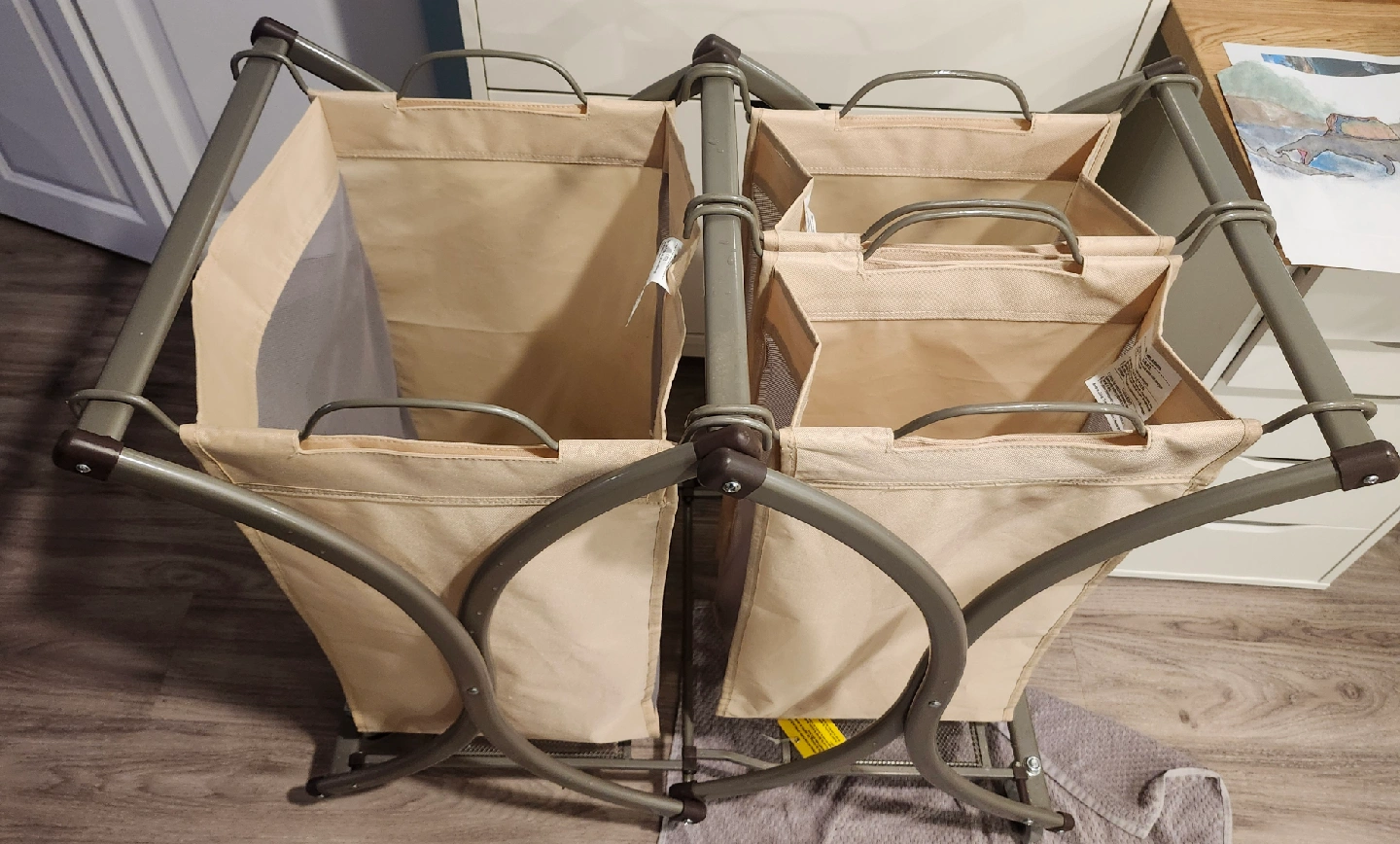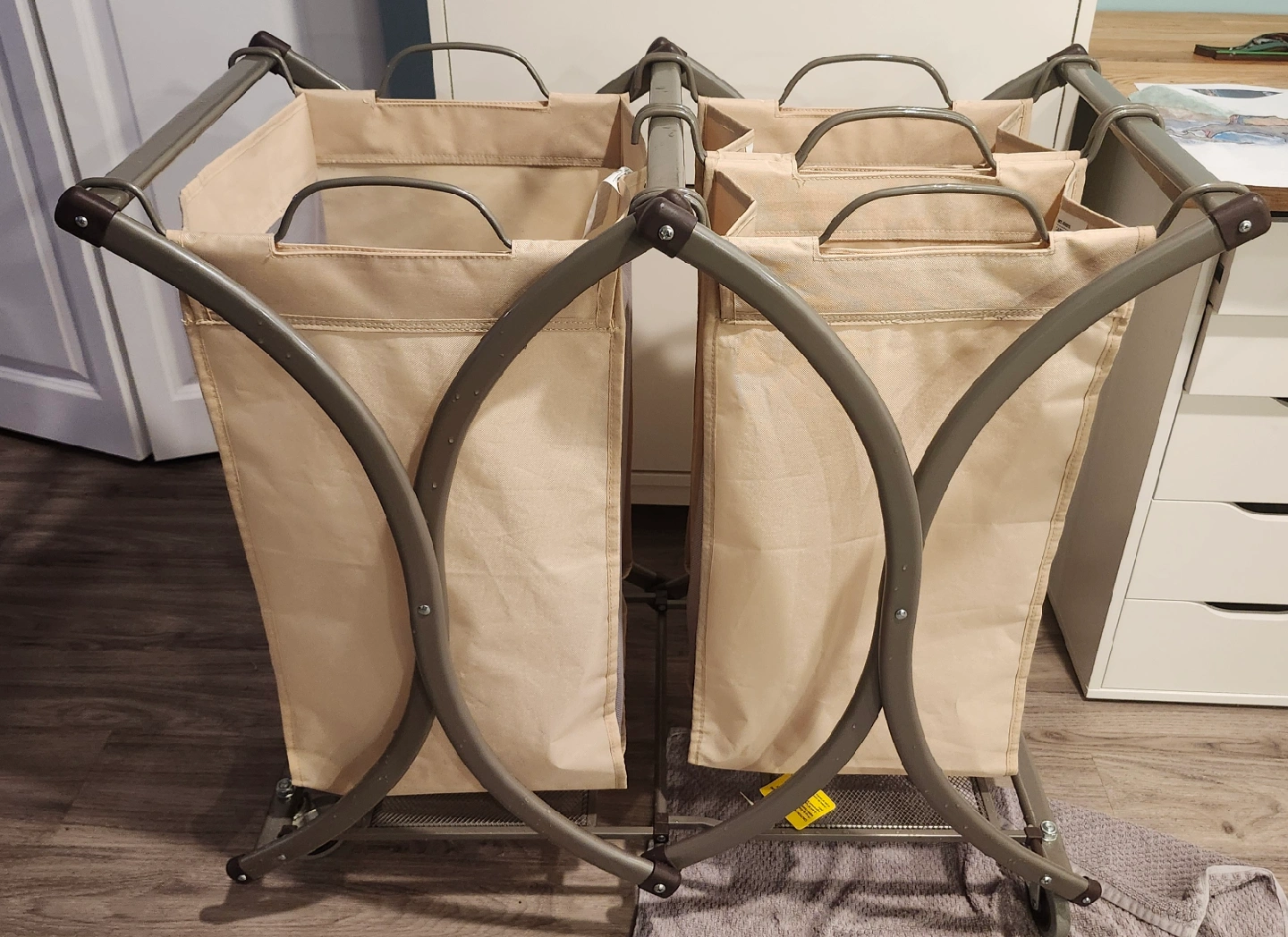 41Here's a handy triple laundry sorter to help keep your clothes organized! It features three separate bags, making it easy to sort your lights, darks, and colours. It also has wheels, so you can easily move it from room to room. Dimensions: - Wide: 19" - Length: 33.5" - Tall: 32" pickup in Lynnwood smoke free home