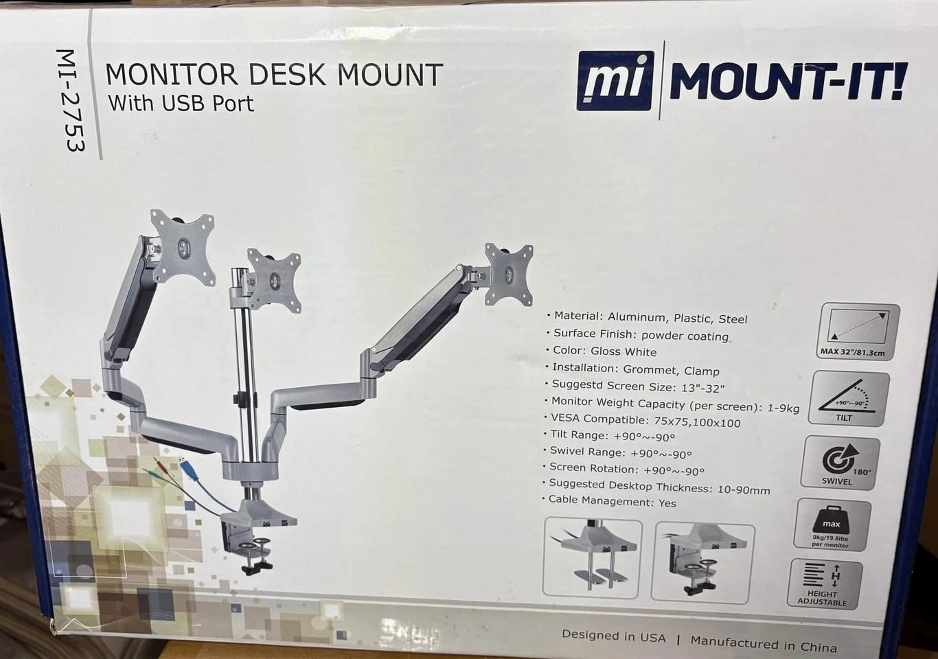 10Triple Monitor Desk Mount w/ USB, USB-C & Audio Ports
